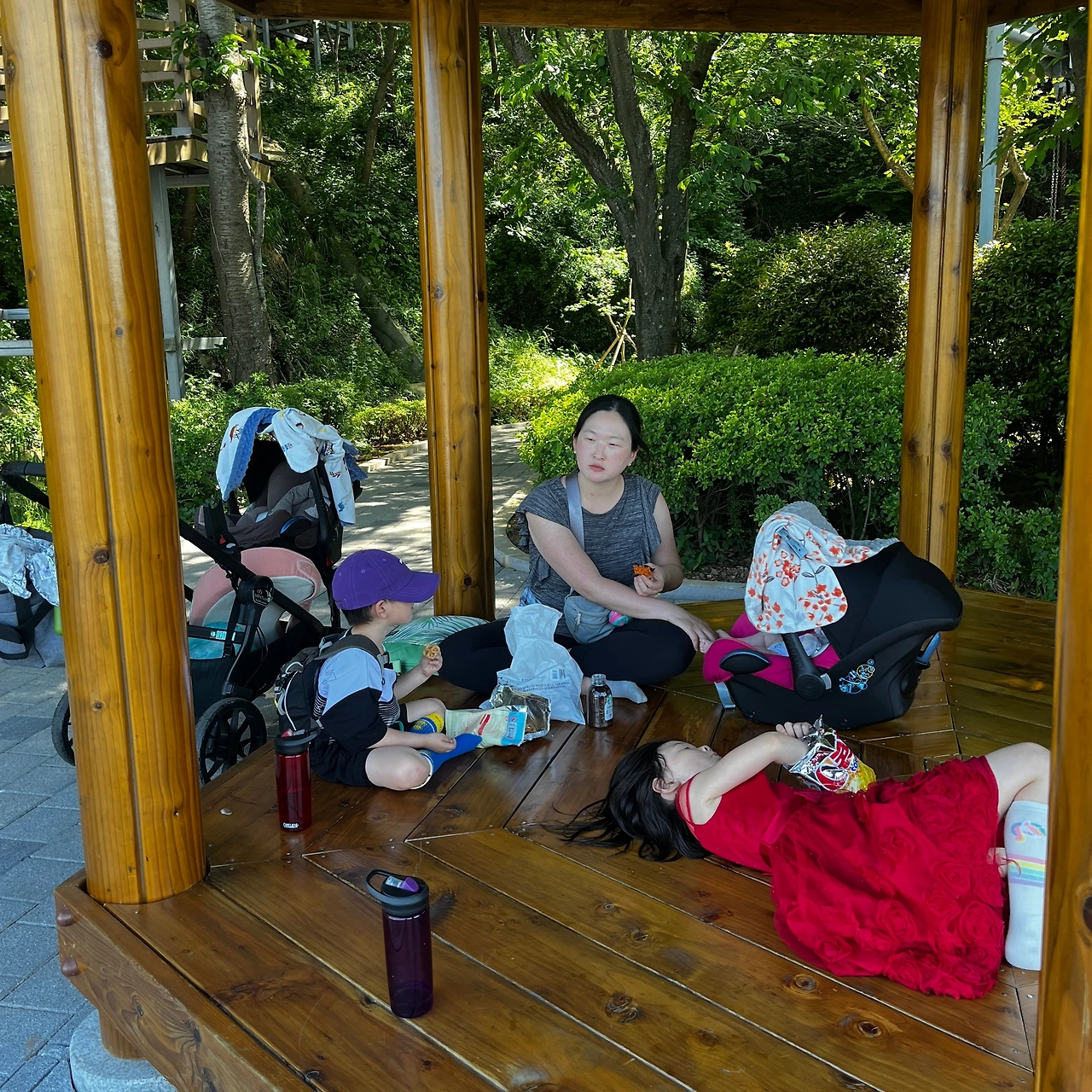 우리는 가까운 공원으로 핸들을 돌렸다. 가는 길 마트에서 김밥과 간식거리를 사고 공원에 도착해서 얼른 첫째, 둘째 아이들에게 간식과 음식을 먹기고, 바쁜 손으로 분유를 타서 쌍둥이들을 먹였다. 그렇게 날 좋은 5월 부처님은 만나지 못했지만 평화롭게 공원 정자에서 피크닉을 했다.