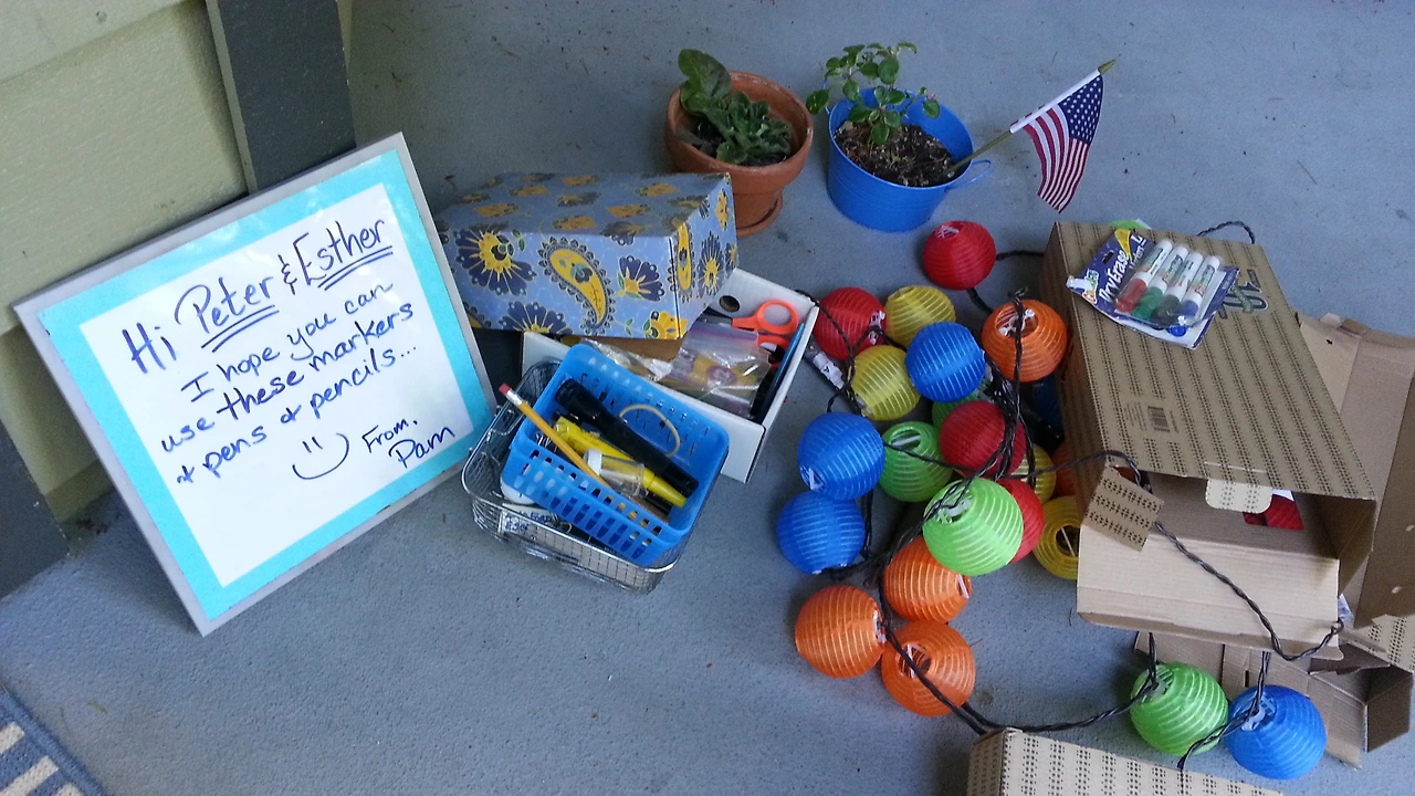 또한 맞은편 아랫집에 팸 아줌마와 개리 아저씨가 살고 계셨다. 우리가 아파트를 보러 갔을 때 우리가 이사 올 거라니까 환영한다고 친절하게 맞아주셨다. 특히 우리 애들을 너무 이뻐하고 정이 많은 분이셨는데 자기 애들이 안 쓰는 물건도 챙겨주었다. 외출 후 집에 왔는데 현관에 메모와 함께 여러 물건들이 놓여있었다. 화이트보드에 이렇게 씌어있었다. 'Hi Peter & Esther I hope you can use these markers or pens or pencils... :) From Pam' 정말 감동이었다. 그런데 바로 얼마 되지 않아 다른 곳으로 이사 간다고 해서 많이 서운했다. 아줌마가 이사 갈 때 서랍장 등 여러 가지 살림도 주고 가셨다.