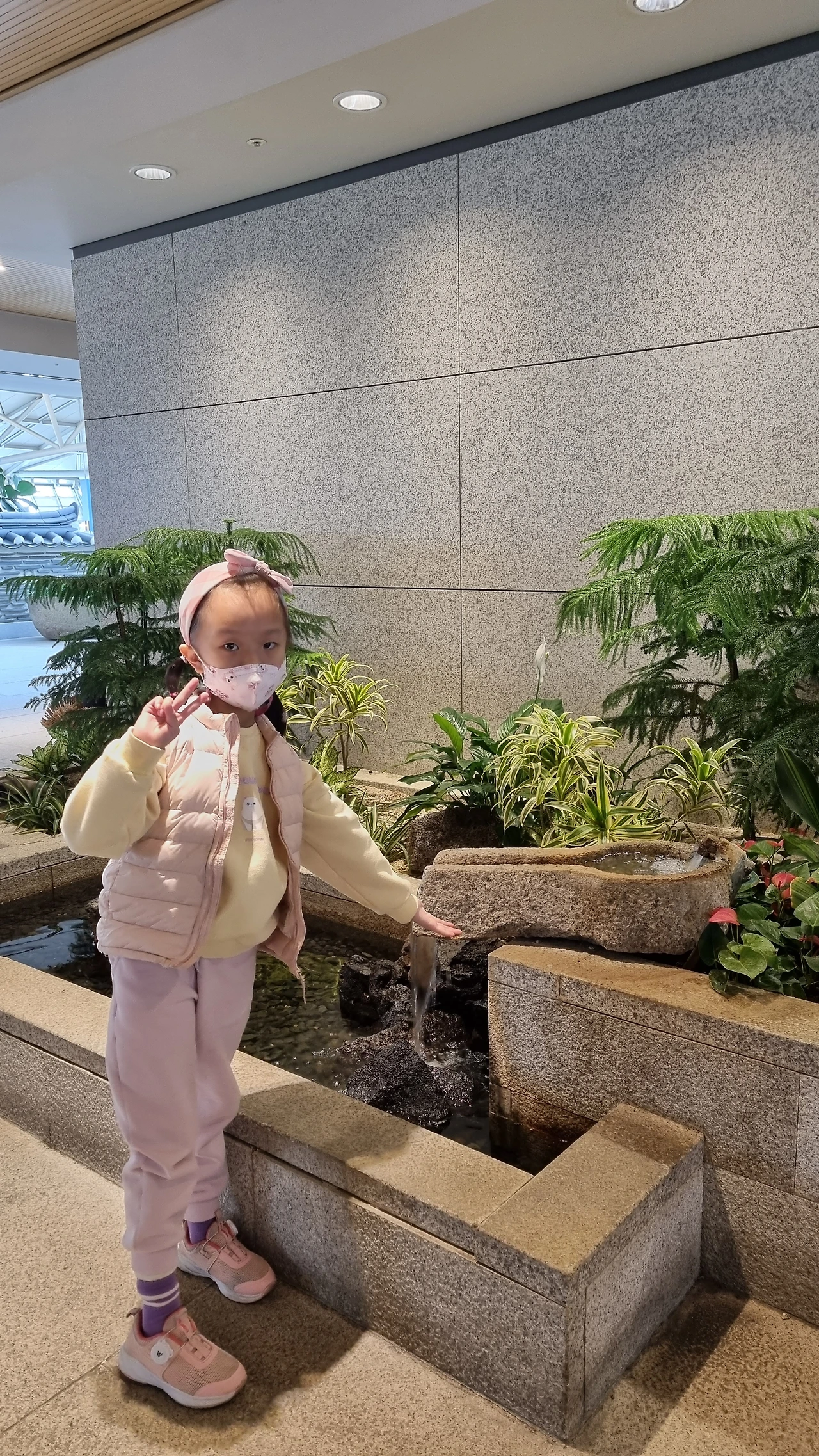 식사 마치고 주변에 구경할 부분이 많았다. 특히 아이는 화초가 진짜가 아닐 거라 생각하고 만졌는데 조화가 아니란 게 너무 신기했나 보다. 그리고 물이 떨어지는 모습을 보고 만져보고 작은 폭포라 한다.