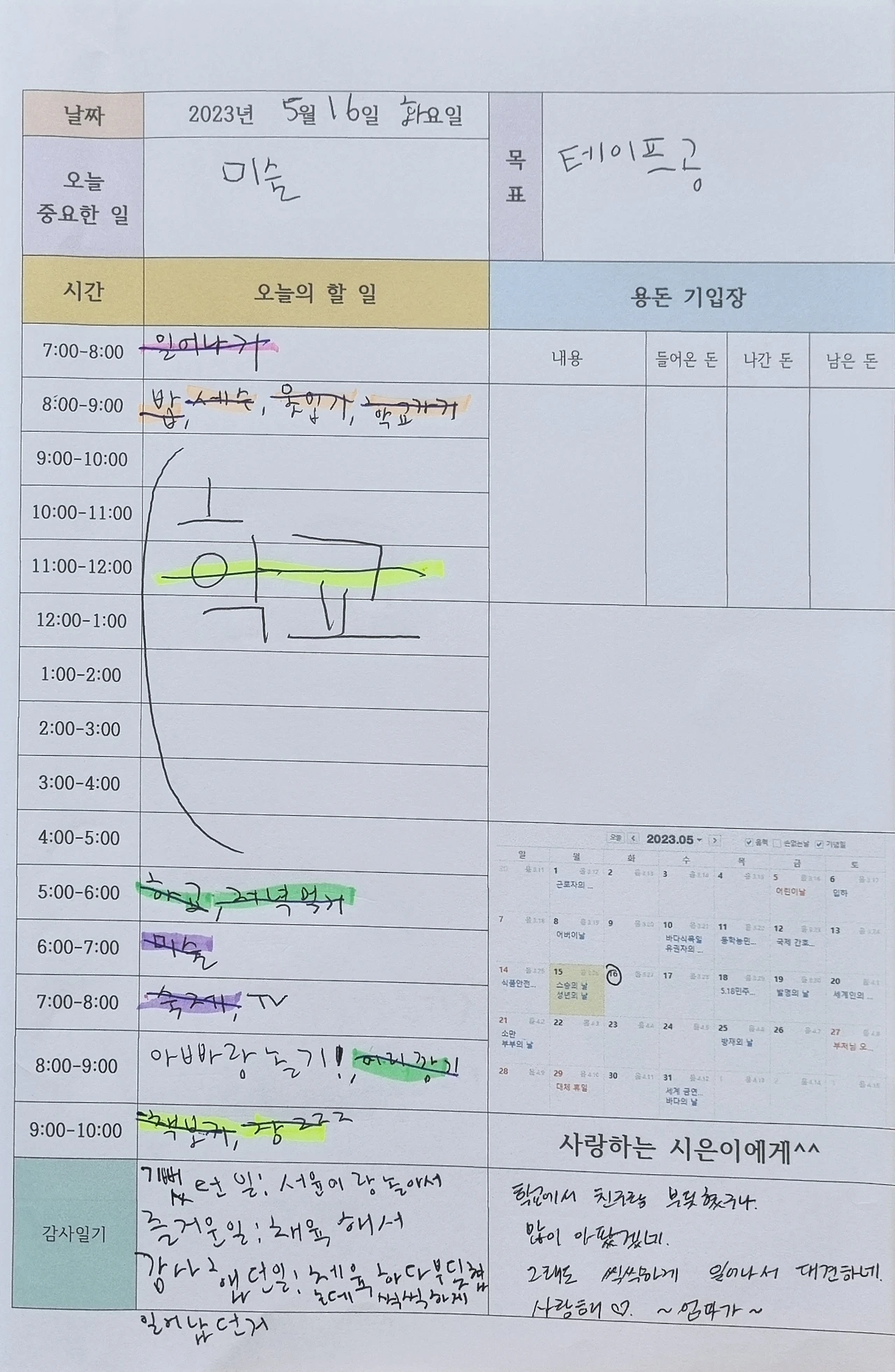 "사랑하는 시은이에게" 공간은 제가 아이에게 매일 편지를 쓰는 내용입니다. 교환일기를 하려다가 아이는 손 편지를 더 좋아해서 하게 되었네요. 시작한 지 얼마 되지 않았지만 아이도 저도 다이어리 쓰는 습관이 루틴이 되어 삶의 질이 달라지고 풍요로워지길 바랍니다.