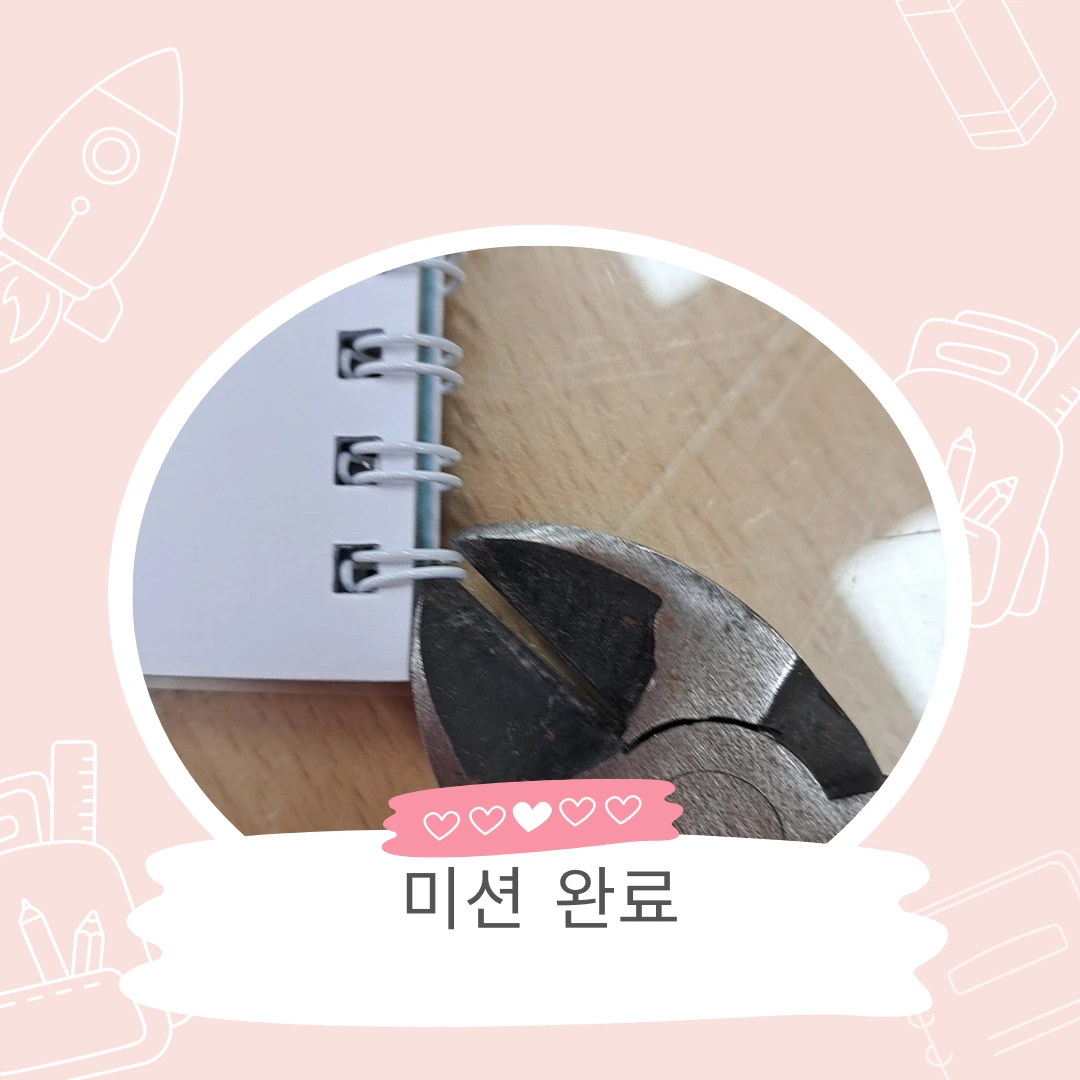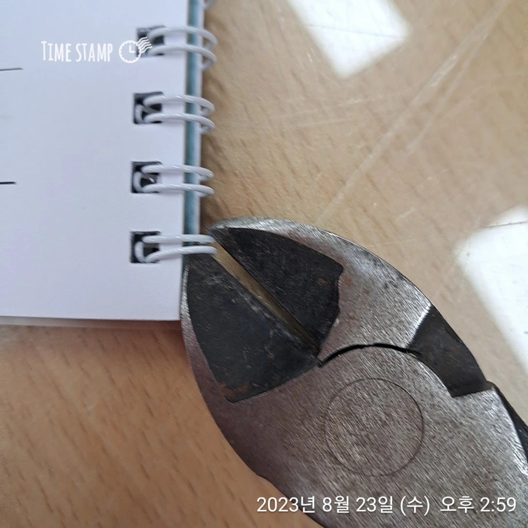 10분 동안 시간이 있다. 우선 잘못된 와이어를 빼야 하는데 손으로 잡아당겼더니 조금 늘어질 뿐 꼼짝도 안 한다. 조금 힘을 줬더니 와이어에 찔려 피가 조금 났다. 피 난 부분을 대일밴드로 붙인 후 검색을 해봤다. 펜치로 자르라고 한다. 어떻게 잘라야 금방 끝날까? 앞에 해야 하나? 아니면 뒤? 여러 번 시행착오 끝에 제본 펼치고 가운데 자르기로 했다. 펜치로 자르는 게 손이 아펐지만 간단하게 해결했다. 시계를 보니 2시 8분이다.