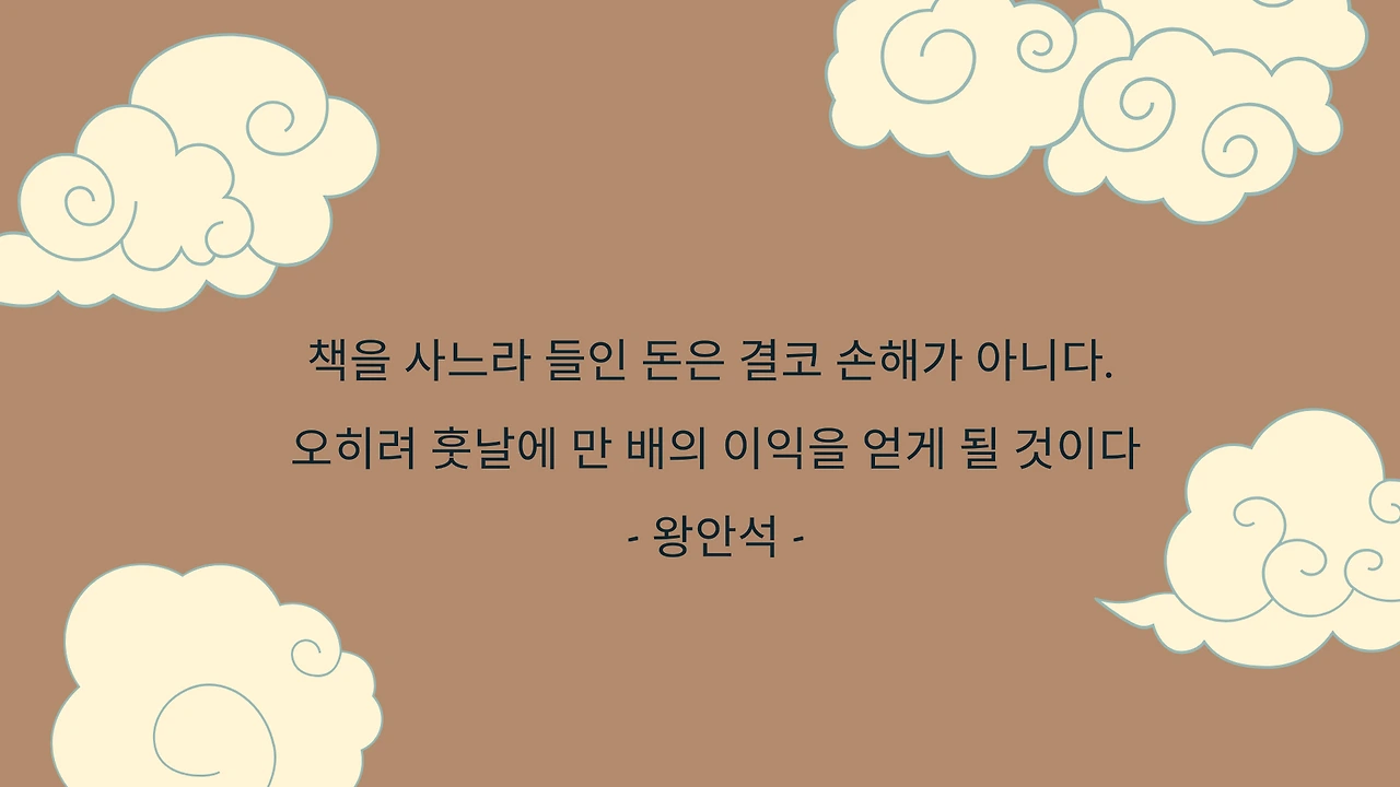 이런 말도 있지 않은가. 왕안석에 의하면 '책을 사느라 들인 돈은 결코 손해가 아니다. 오히려 훗날에 만 배의 이익을 얻게 될 것이다'라고...