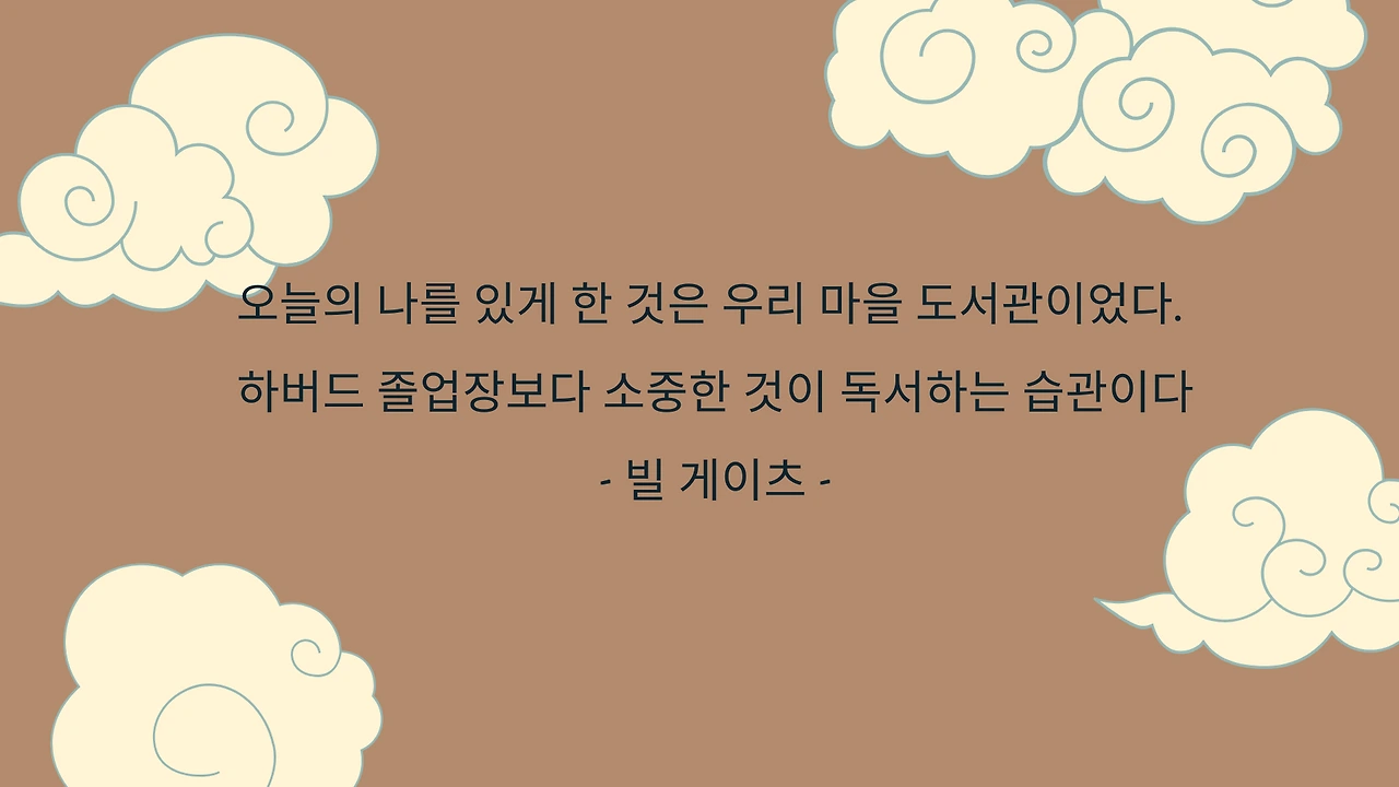 Microsoft의 창업주인 빌 게이츠에 의하면 '오늘의 나를 있게 한 것은 우리 마을 도서관이었다. 하버드 졸업장보다 소중한 것이 독서하는 습관이다'라고 하였듯이, 훗날 우리 딸이 '오늘의 나를 있게 한 것은 우리 집 거실이었다. 00대 졸업장보다 소중한 것이 독서하는 습관이다'라고 하길 바라면서....