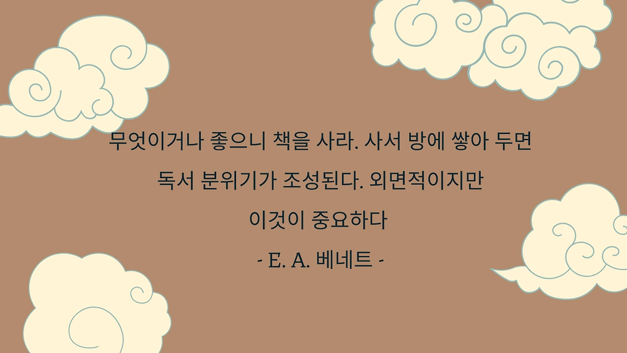 '무엇이거나 좋으니 책을 사라. 사서 방에 쌓아 두면 독서 분위기가 조성된다. 외면적이지만 이것이 중요하다 -E. A. 베네트-'