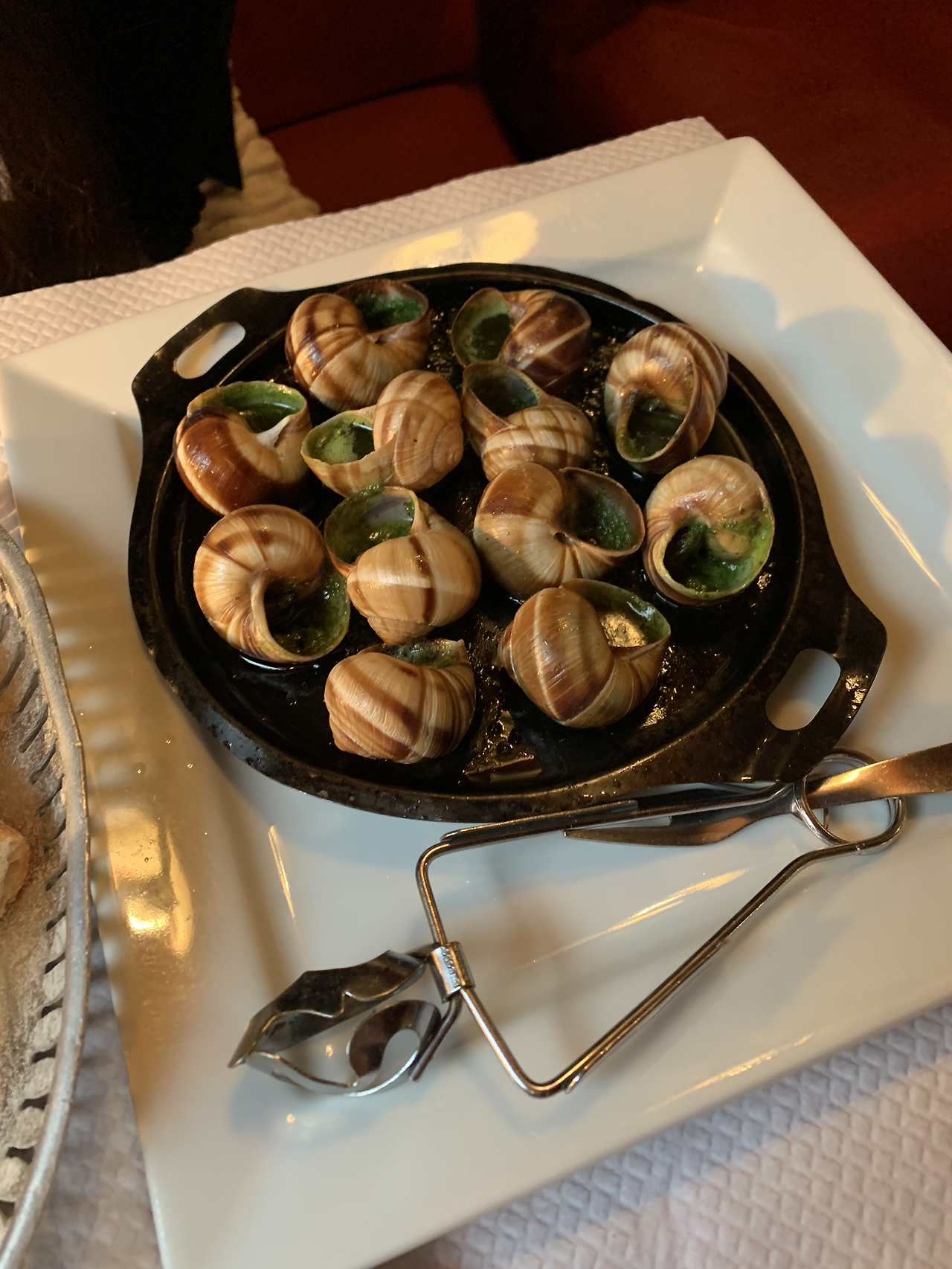 메뉴를 보며 고심 끝에 우리는 애피타이저로 토마토 리코타 샐러드, 에스까르고(달팽이 요리), 본식으로는 소고기 스테이크, 디저트로는 크림 브륄레를 시켰다. 하지만 우리는 몰랐던 것이다. 파리는 느림의 미학이 통하는 나라라는 것을. 해가 완전히 지기 전에 숙소에 돌아가는 것이 목표였던 나는 창밖이 서서히 어두워지는 것을 보며 얼굴을 굳힐 수밖에 없었다. 하지만 나의 초조함이 타타의 여행의 일부를 망칠 새라 안 좋은 생각을 떨쳐내려 노력했다. 레스토랑의 내부는 한국에서는 볼 수 없을 정도로 이색적이었고, 어두워져 가로등이 켜진 창밖은 내게 괜찮다는 듯 빛을 내고 있었다.