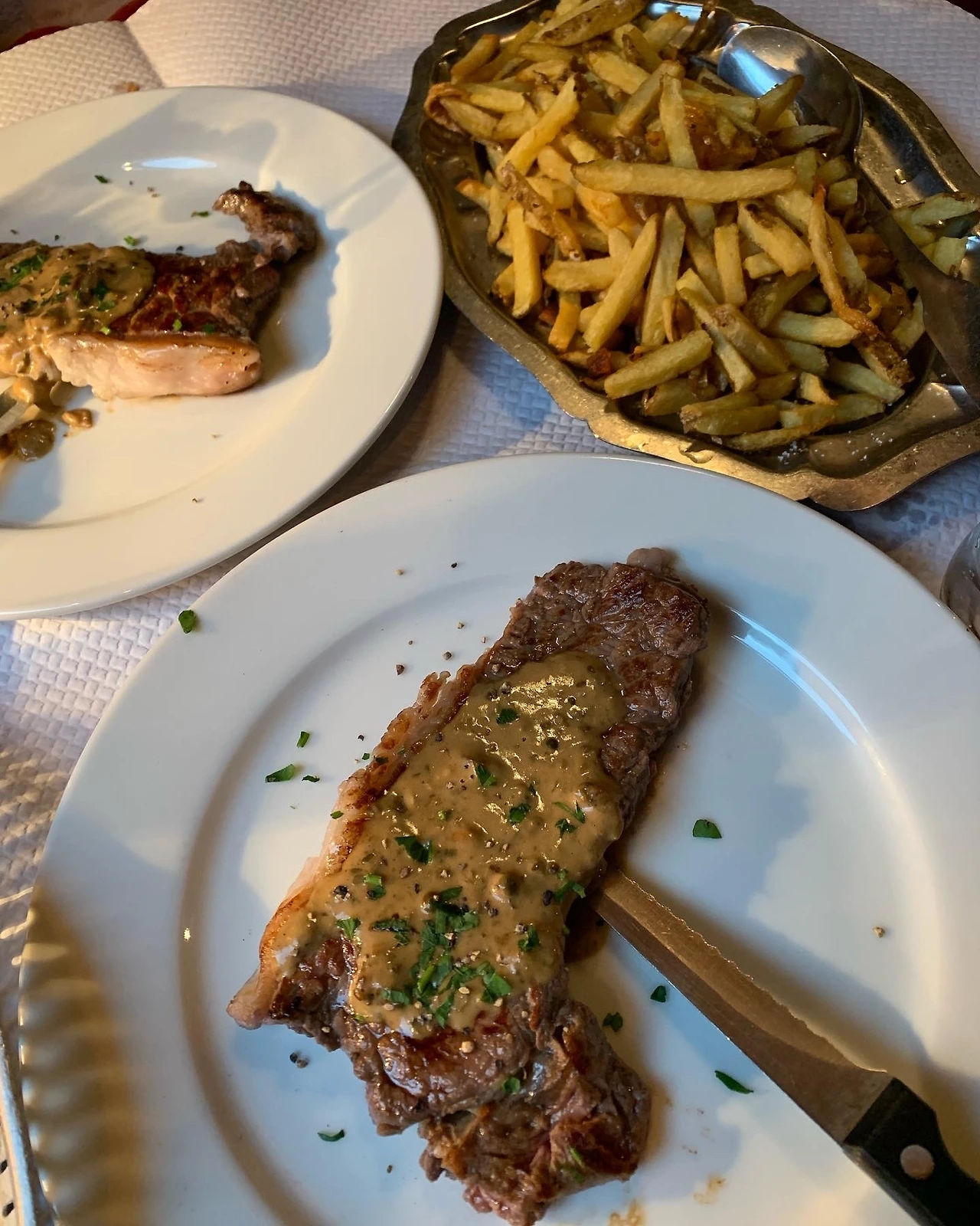 파리의 가장 좋은 점은 식전 빵과 감자튀김이 무료인 곳이 많다는 것이다. 물론 점심을 먹은 곳의 식전 빵은 잇몸이 아플 만큼 딱딱했다. 그래도 공짜니 손해 본 것은 아니었다. 잠자코 기다리다 보니 음식이 나왔다. 타타와 나는 열심히 사진을 촬영하고 티본스테이크를 먼저 정성스럽게 잘라 입안에 넣었다.
