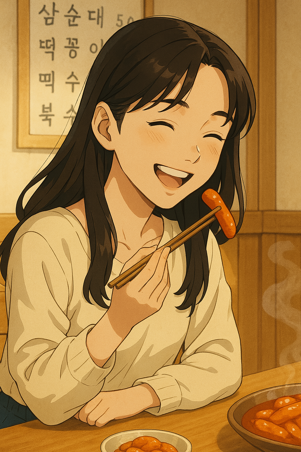 조용한 분식집 한쪽, 김이 모락모락 올라오는 떡볶이를 앞에 두고 앉았다.