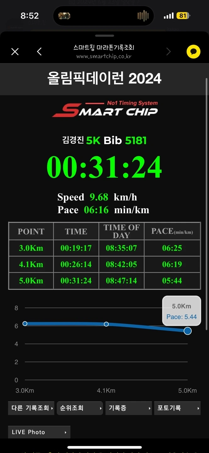 작은 탄성과 함께 빠르게 메달과 간식존으로 달려가 음료와 메달, 간식을 받았다. 손에 땀이 미끌거려서 옆에 있던 관계자분에게 음료 뚜껑을 열어달라고 부탁해서 한 입 마시니 그제야 시야가 트였다. 친구는 아직 달리는 중이어서 기록을 확인해 보니 집 근처 산책로에서 뛰던 결과보다 4분이나 빠른 결과가 눈에 보였다.