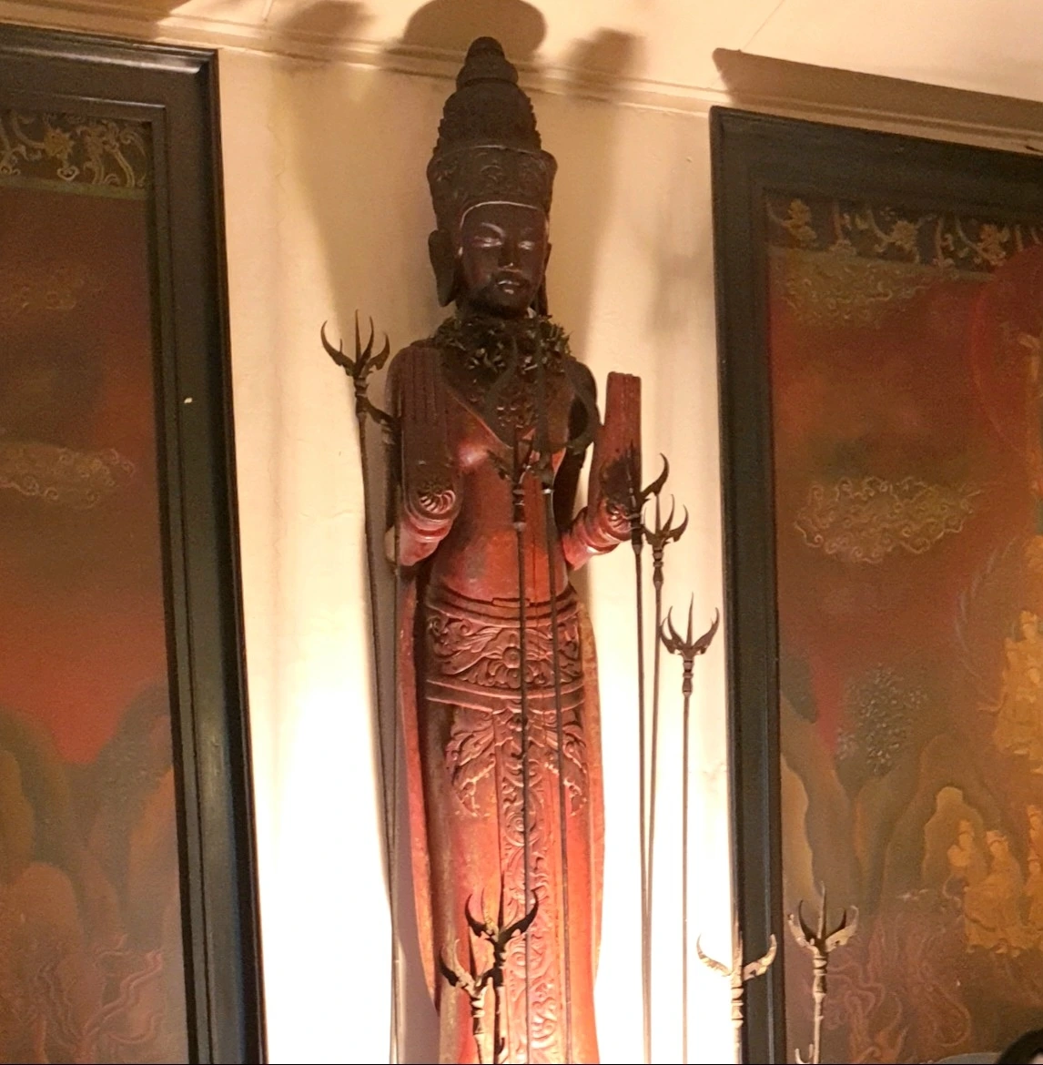 인도네시아 전통 양식의 목조문, 높다란 기둥, 석상, 그리고 낮게 깔린 조명 속 어스름한 홀.