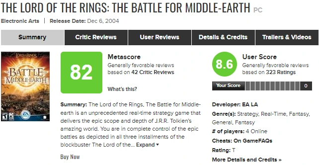 그 중 가장 좋아하던 게임은 바로 반지의 제왕 IP(지적재산권)를 바탕으로 한 RTS(실시간 전략)게임 ‘반지의 제왕: 중간계 전투(이하 중간계 전투)’였다. EA 로스앤젤레스가 개발한 이 게임은 판타지 소설의 대부 격이자 영화로도 세계적인 성공을 거둔 ‘반지의 제왕 시리즈’를 그대로 구현했다. 성공한 IP의 힘을 믿고 어설픈 완성도로 출시한 여타 게임들과는 달리 꽤 괜찮은 작품이었다. 전 세계 100만장 이상이 판매됐으며, 메타크리틱 점수 82점의 호평을 기록했다.