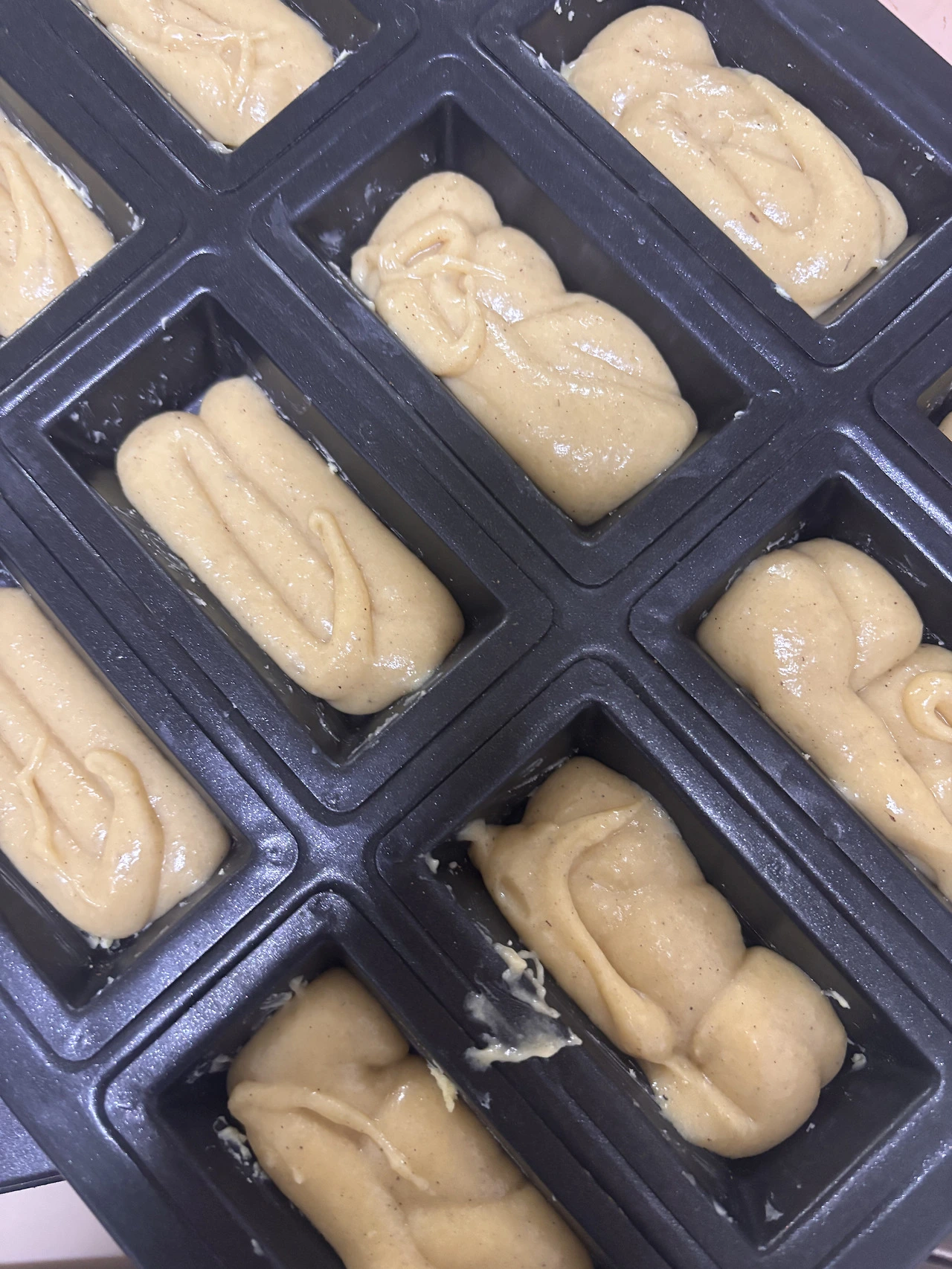 큰 볼에 1의 혼합물에 2의 액체류를 넣어준다 살짝 믹스 후 40도 정도로 식은 (너무 뜨거워도 너무 식어도 안됨) 녹인 버터를 슬슬 믹스해 가루가 안 보이면 랩을 밀착시켜 통째로 냉장 보관 한다 2-3시간 후 다시 반죽을 믹스한 후 팬닝 한다