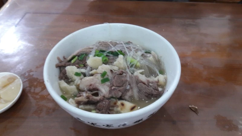 위 사진의 밀가루 빵을 손으로 작게 뜯어 그 위에 고기 국물을 부어 먹는 음식이다.
