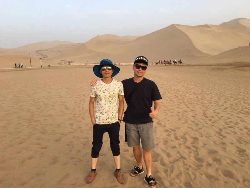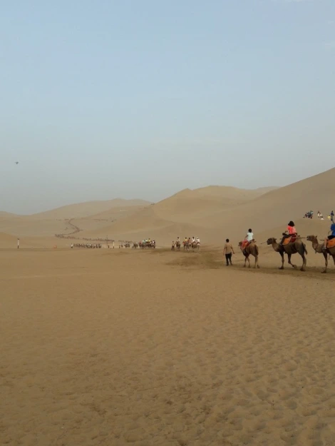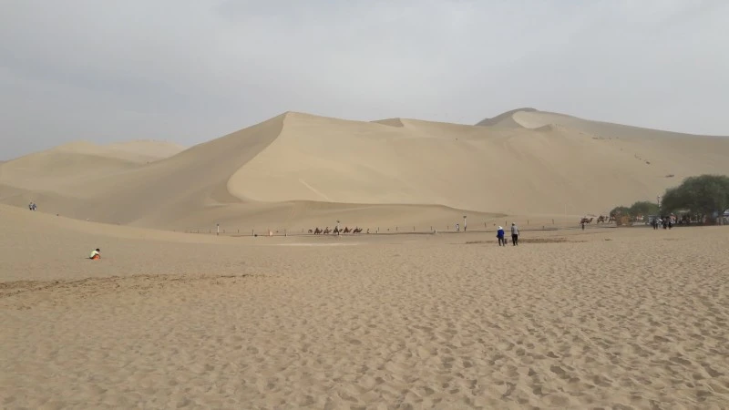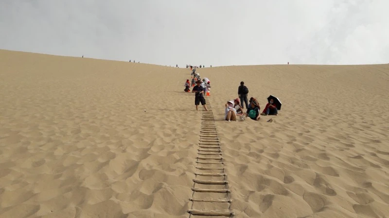 호스텔에 짐을 풀고 잠시 쉬다가 명사산(鳴沙山)으로 향했다. 둔황 사막에 있는 모래산인 명사산과 그 아래에 있는 오아시스 월아천(月牙泉)은 막고굴과 함께 둔황을 대표하는 관광지이다. 명사산은 맑은 날에 바람에 날리는 모래소리가 수만의 병마가 두드려 치는 북과 징 소리같이 들린다고 하여 '울 명(鳴)' 자에 '모래 사(沙)' 자를 써 '명사산(鳴沙山)'이라 이름 붙여졌다. 신기하게도 시가지 바로 옆에 사막이 펼쳐져 있었다. 월아천을 한 바퀴 돌아보고 맞은편의 모래언덕에 올랐다. 나무 사다리를 깔아놓기는 했지만 발이 푹푹 빠지는 모래언덕을 오르기란 여간 힘든 게 아니었다. 20여 분을 힘겹게 올라 뒤를 돌아보니 사막 한가운데 폭 담겨있는 월아천의 모습이 한눈에 들어왔다.