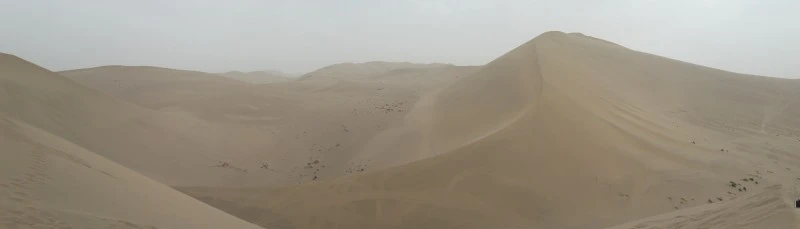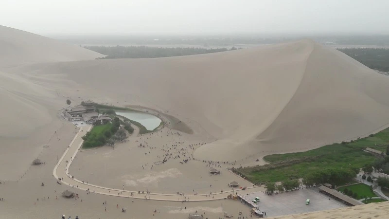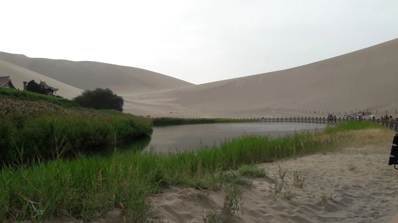 오아시스는 사막을 여행하거나 사막에서 살아가는 모든 생명체에게 없어서는 안 되는 중요한 물 공급처이다. 실제로 오아시스는, 우리가 막연히 상상해 온 야자수 몇 개 거느린 사막의 작은 샘물 정도의 크기가 아니다. 수만 명의 사람이 오아시스 하나에 의지해 농사지으며 살아갔으며, 오아시스 하나마다 독립된 왕국이 있을 정도로 풍부한 물의 원천이다. 내가 지나 온 하서주랑과 신장의 도시들도 오아시스를 기반으로 형성된 도시들이다. 하지만 이곳 월아천은 평소 우리가 갖고 있던 오아시스의 이미지에 가장 근접했다. 황량한 모래사막 한가운데서 갑자기 솟아 나온 작은 못. 생긴 게 초승달 모양이어서 월아천(月牙泉)이라 이름 붙여졌다는데, 매년 모래 광풍이 불어도 이곳만큼은 한 번도 모래에 덮이지 않아 기이하게 여겨졌으며, 이곳에는 신선이 산다고 하여 샘 옆에 도교사원도 지어져 있다. 이 모래언덕에 올라 바라보는 일몰이 장관이라고 하는데 내가 간 날은 아쉽게도 구름이 잔뜩 껴 일몰을 제대로 보지 못했다. 다음날 날이 맑으면 다시 와보려고 했지만 이 역시 여의치 않게 되었다. 모래언덕을 내려올 때는 나무 사다리가 없는 곳으로 발이 푹푹 빠지며 뛰어내려왔다. 마치 어린아이처럼.