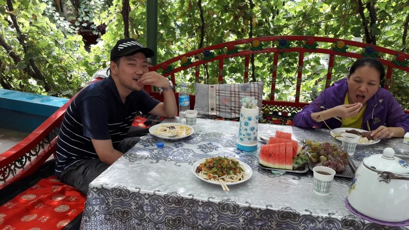 포도계곡에서의 점심식사. 신장 사람들이 즐겨먹는 양고기 볶음밥인 양좌판(羊抓飯)을 먹었는데, 손으로 먹는 게 전통이다.