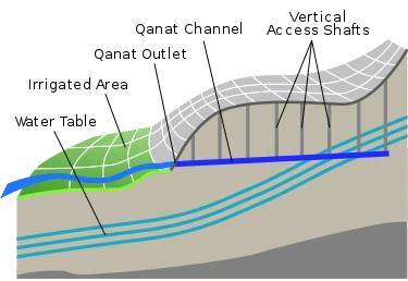 카레즈(Kariz)는 중동에서 유래한 수리 관개시설인데, 기원전 700년에 개발된 오랜 수리 방법이 아직도 유용하게 쓰이고 있다. 이곳 투르판은 지표면의 증발량이 어마 무지하다. 실제로 손빨래한 빨래를 제대로 짜지도 않고 호스텔 마당에 널어두었는데 불과 2~3시간 만에 다 말라버렸다. 이러한 자연환경 속에서 농업용수와 생활용수의 증발을 최대한 막기 위해 고안된 방법이 바로 카레즈이다. 쉽게 말해 지하에 수로를 파는 것인데, 아래 사진을 참고하시면 좋을 것 같다.