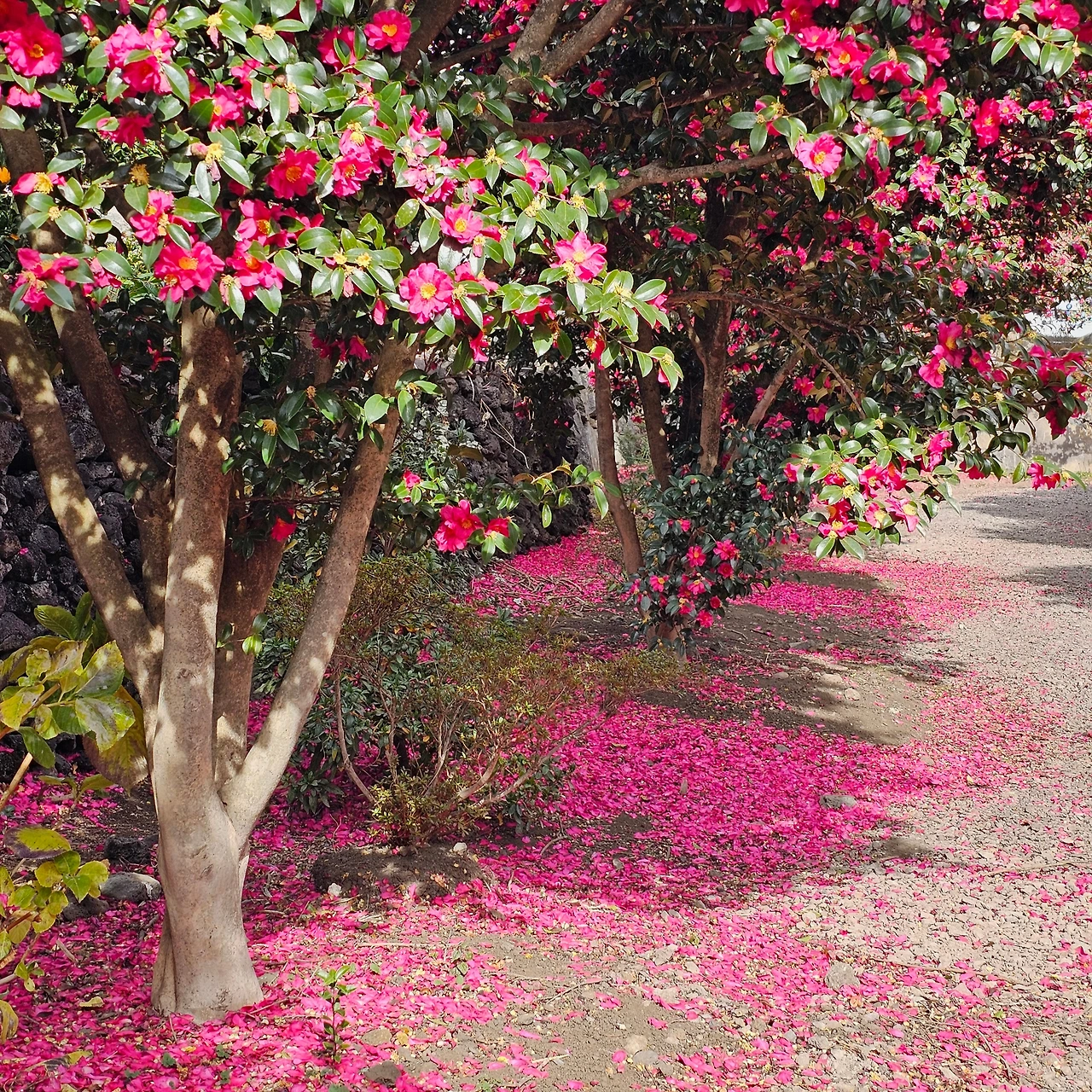 다음 날은 동백꽃 투어를 했다. 한 달 전에 모두 와본 장소이지만 그이의 감탄이 좋아서 내가 가장 좋았던 곳으로 안내했다. 동백꽃은 조금은 색이 바랬지만 바닥에 떨어진 꽃잎이 너무 아름다웠다. 붉은 융단을 깔아 놓은 듯한 풍경이 너무 예뻤다.