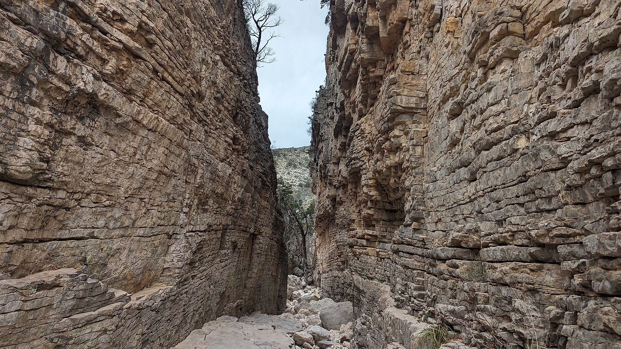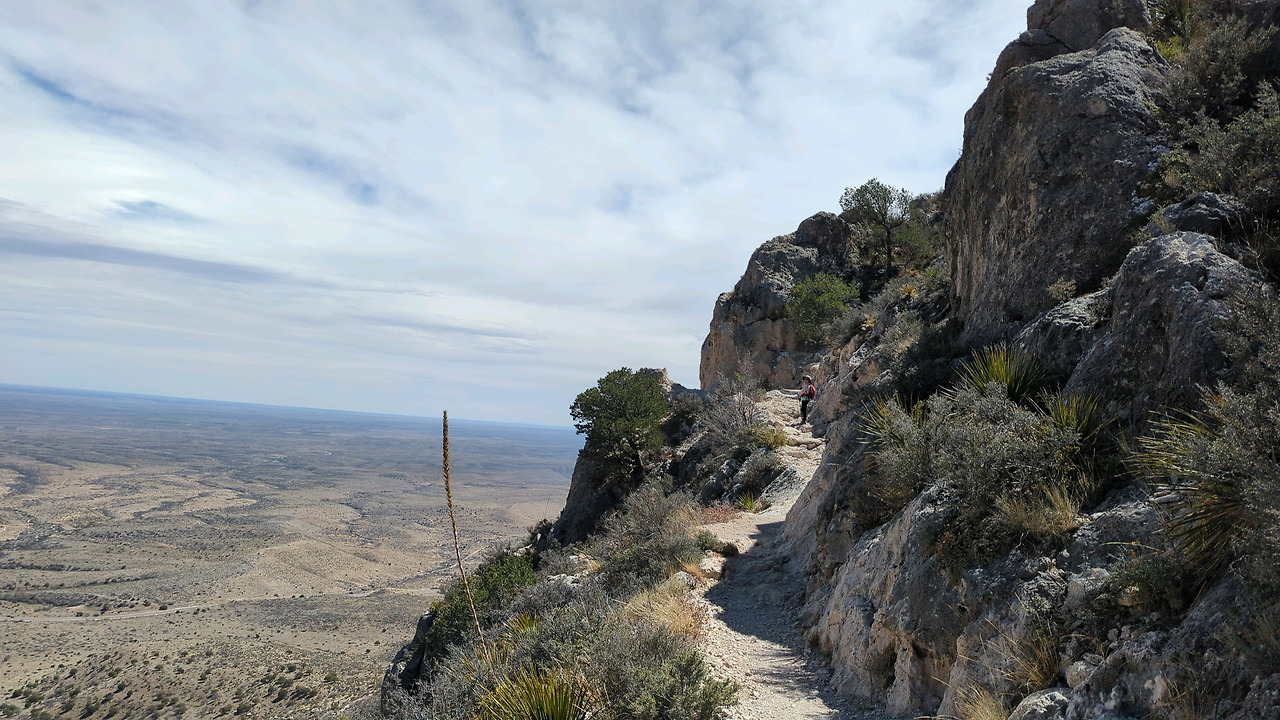과달루페 정상 코스는 파인 스프링스 트레일헤드(Pine Springs Trailhead)에서 시작한다. 편도 6.4 km 중 처음 2km 정도는 지그재그 오르막길로 가파르고 메마른 돌길이다. 가장 힘든 구간이기도 하다. 힘든 구간이 거의 끝나가는 지점에서 잠깐 숨을 고르며 산길 아래를 내려다보았다. 깊은 협곡 위로 보이는 바위로 이루어진 산세가 웅장하고 심상치 않았다. 이게 ‘페름기 암초이던가’라 생각하며 계곡 넘어 평야를 바라보니 오는 길에 보았던 허허벌판과 그리고 하늘과 맞닿은 지평선이 까마득히 보였다.
