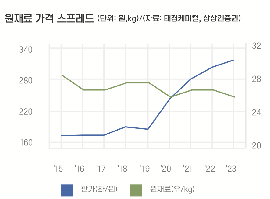 시총이 작은 주식을 선호하는 내가 비교적 큰 태경케미컬이 매력적이라고 생각하는 이유는 꾸준히 증가하는 실적이다. 화학 회사에서 스프레드라고 부르는 판가와 원재료 가격의 차이가 꾸준히 벌어지는 중이다. 원재료는 비슷한 가격에 사 오는데, 판매하는 가격이 비싸지니까 영업이익이 줄어들 수 없는 구조이다.