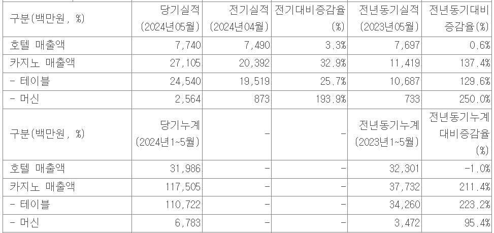 카지노의 실적 견인이 눈부시다. 2024년의 1월 ~ 5월의 호텔 매출액은 작년에 비해 1% 감소했지만 카지노의 매출은 3배 이상으로 성장했다.