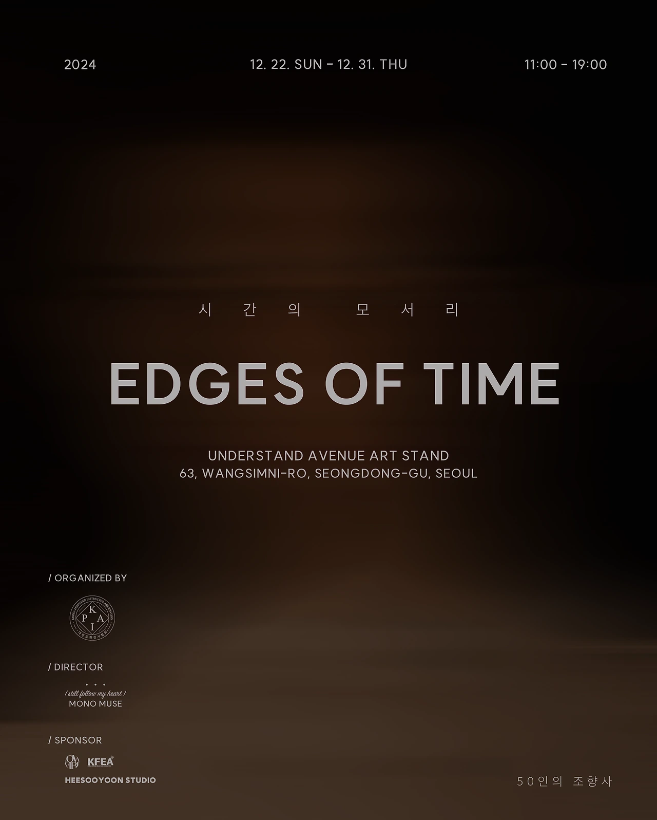 <시간의 모서리>전은 KPIA 대한조향강사협회에서 주최하고 MONOMUSE 모노뮤즈가 총괄기획하여, 협회 소속 50인 향 작가들과 함께하는 국내 최대 규모의 향 작가 전시다. 또한, 한국 한국화훼교육협회 KFEA, 사운드 아트 외 다양한 작가와의 협찬 및 콜라보로 '시간의 모서리'를 향뿐만 아니라, 글과 꽃, 빛과 음악이 공존하여 공간을 더욱 몰입감 있게 만든다.