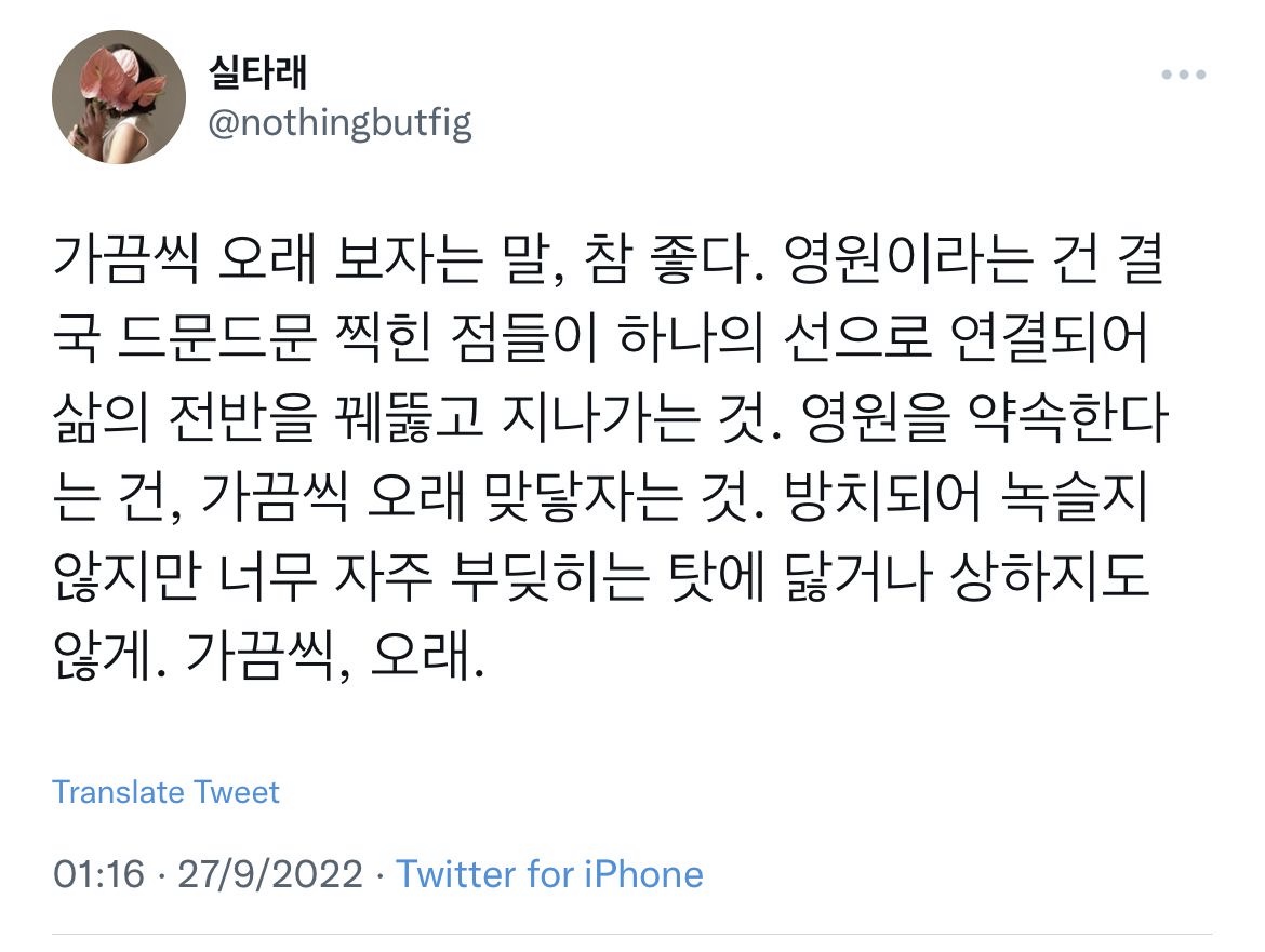 누군갈 열렬히 사랑하는 내 모습이 밉지 않다. 혼자가 제일 편하지만, 그래도 사랑을 꾸준히 하고 싶은 욕심 가득한 나. 나는 그런 내가 참 좋다.