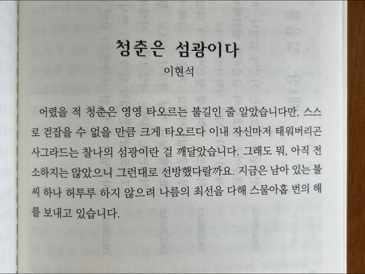 생각이 많은 날, 산책하며 누군지 모를 미래의 사람에게 항상 이야기를 했다. ”나는 이런 사람입니다. 이런 사랑을 해왔고요. 저는 당신을 이런 태도로 대하고 있어요. 이런 상처가 있지만, 이게 나를 이렇게 성장을 시켜줬어요. 서로의 호시절에 우리가 만나, 메모장에만 적어뒀던 나의 이야기를 꺼낼 수 있어 행복합니다.“