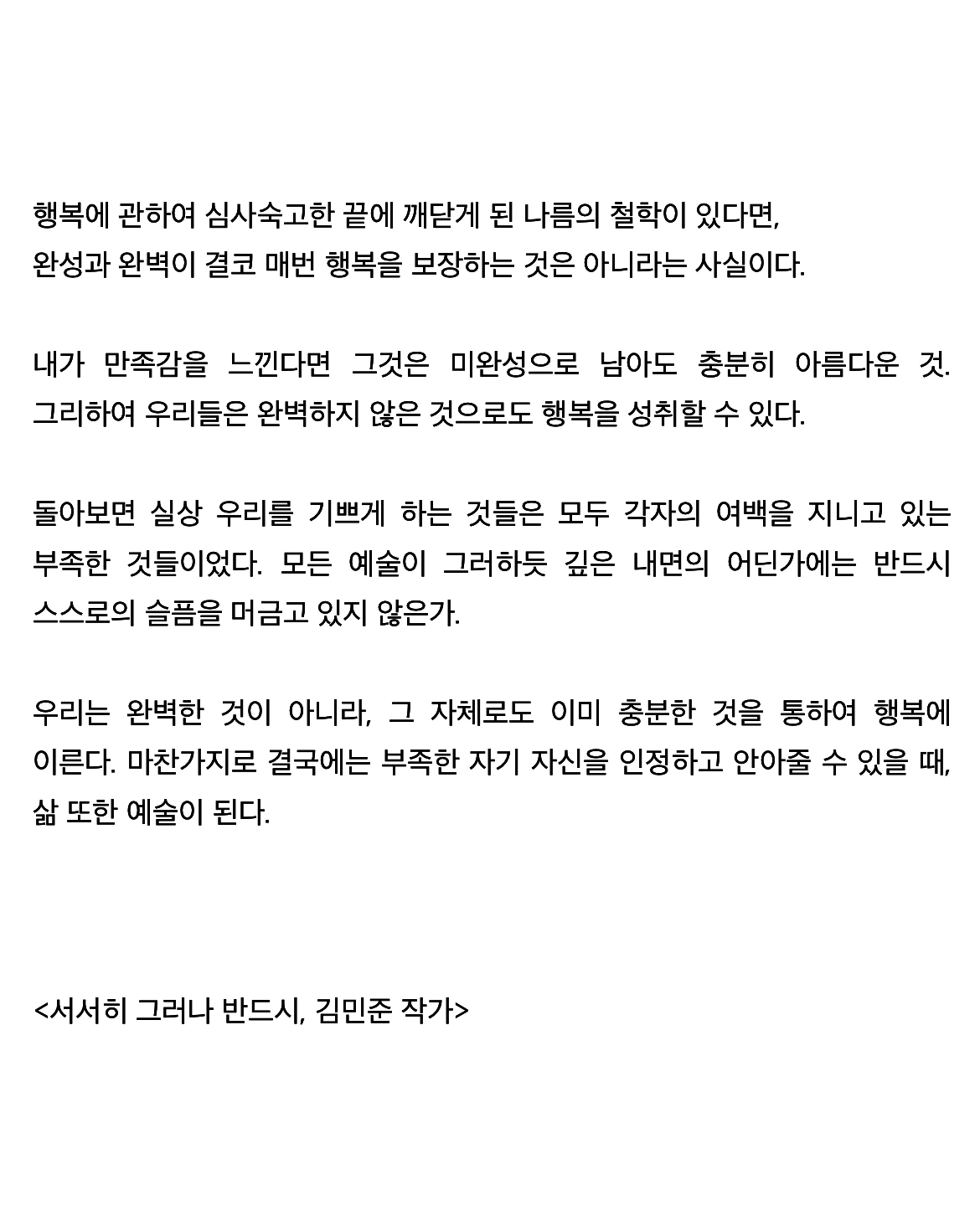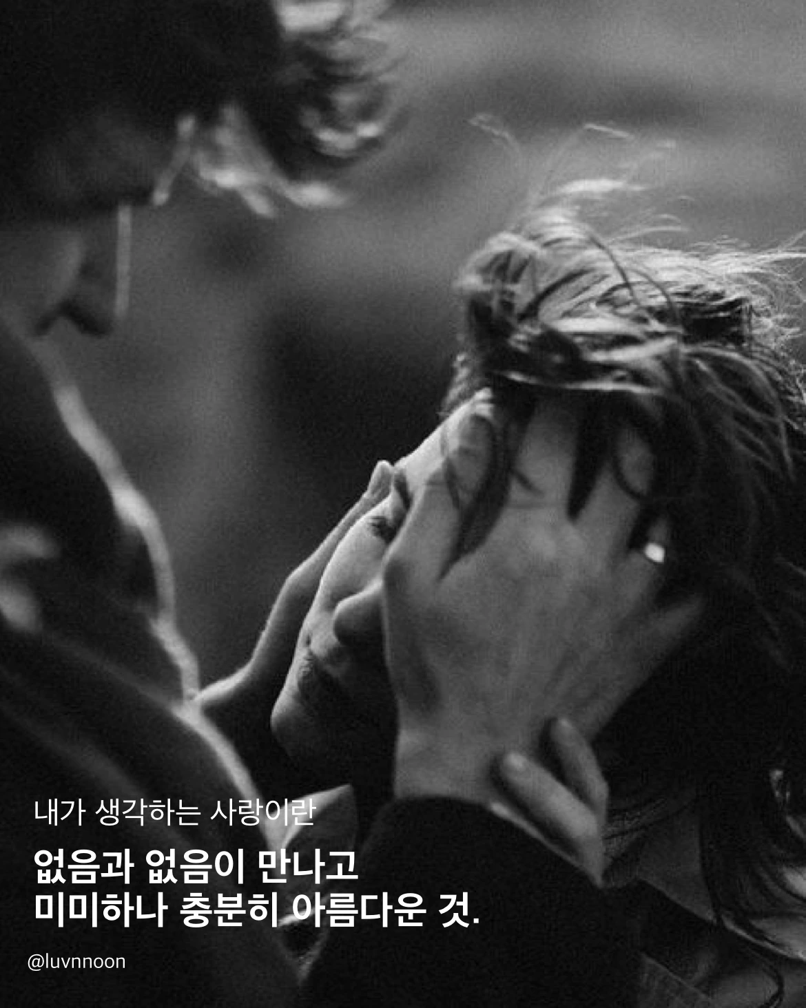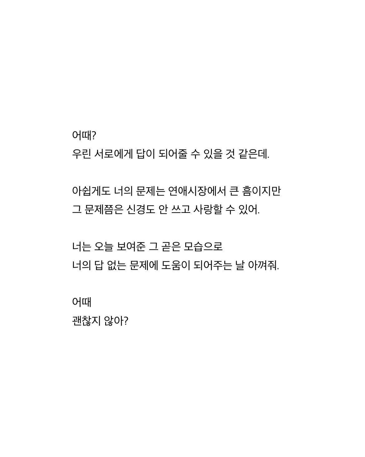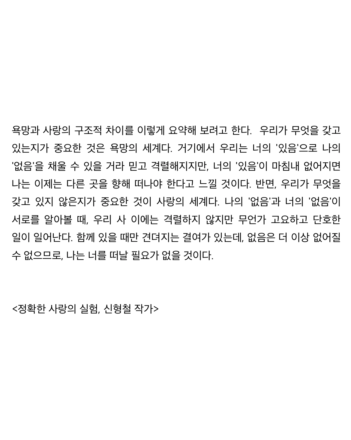 상대의 있음이 아닌 없음을 예상하고 만나며, 연애 시장에 취약한 개인주의적 관계를 지향하고, 타인이 보기에 미완성 같을지라도 그것만으로도 충분히 행복한 관계. 그렇게 진심을 기반하여, 서로가 서로에게 스며드는 관계를 말이다.