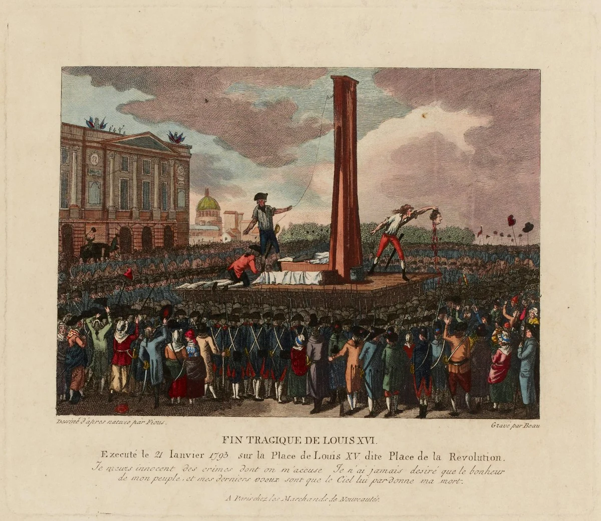 The Tragic End of Louis XVI, 1797, coloured etching by Beau after Fious
