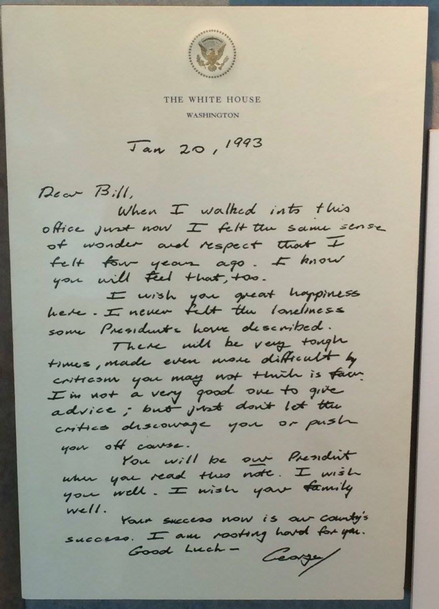 지난 몇 주 동안 인터넷 상에서 미국의 41대 대통령 조지 부시 George H.W. Bush가 다음 대통령인 빌 클린턴 William J. Clinton에게 남긴 편지가 회자되었다. 각각 공화당과 민주당의 대통령 후보로 나선 대선에서 패배한 부시가 승리한 클린턴에게 남겨 준 따뜻한 조언이 담긴 편지다. 개인적인 바람과 함께, 대통령으로서의 성공이 미국의 성공임을 상기시키며, 어렵고 외로운 자리를 맡는 새 대통령과 그 가족에게 행운을 기원한다. 참으로 멋진 편지가 아닌가? 그의 인격이 묻어나는 편지다. 부시가 부통령 시절에 했던 연설을 보면서, 뜻도 모르면서, 그의 반듯한 모습과 영어 발음을 흠모했던 기억이 새롭다.