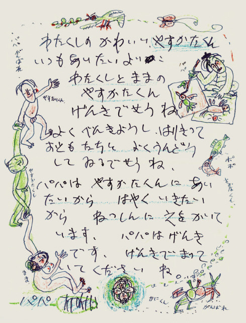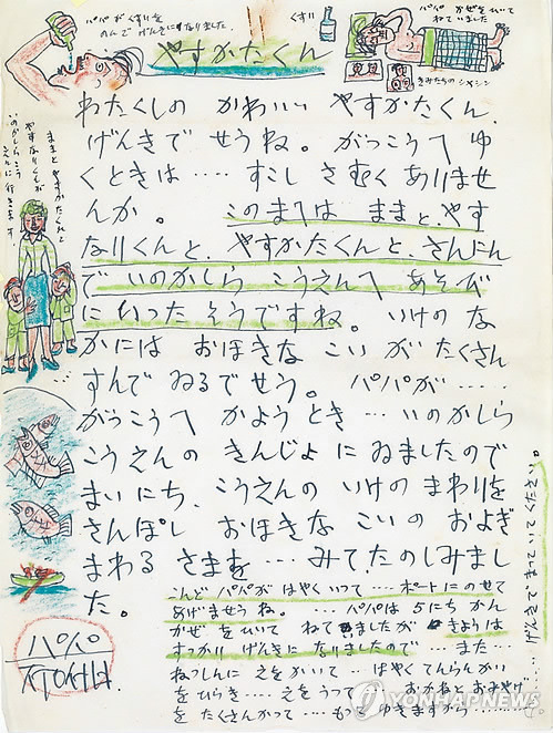 두 아들에게 보내는 편지들은 안쓰럽기 그지없어 다 읽어내기가 어렵다. 아들에게 보낸 편지들은 꿈에서라도 매일 만나는 가족들과 함께 지낼 상상으로 그린 - 아빠와 엄마와 아이들이 손을 맞잡고 있는 - 그림들로 가득하다. 자전거 하나 제대로 사 주지 못하는 자신의 모습에서 자괴감을 떨치지 못했기 때문일까, 그는 이번 전시회만 잘 되면 아빠가 꼭 자전거를 사주겠노라고 여러 편지에 걸쳐 썼다. 그가 마주했던 처절한 가난이 종이 한 장, 딱 한 장을 더 마련할 여유도 주지 않으면, 중섭은 형제에게 한 통의 편지를 보낼 수밖에 없었다. 그러다가 다시 종이가 생기면, 그는 똑같은 그림을 두 장 그려서 형제에게 각각 편지를 적었다. 그래서 그의 편지들은 더 절절하다.