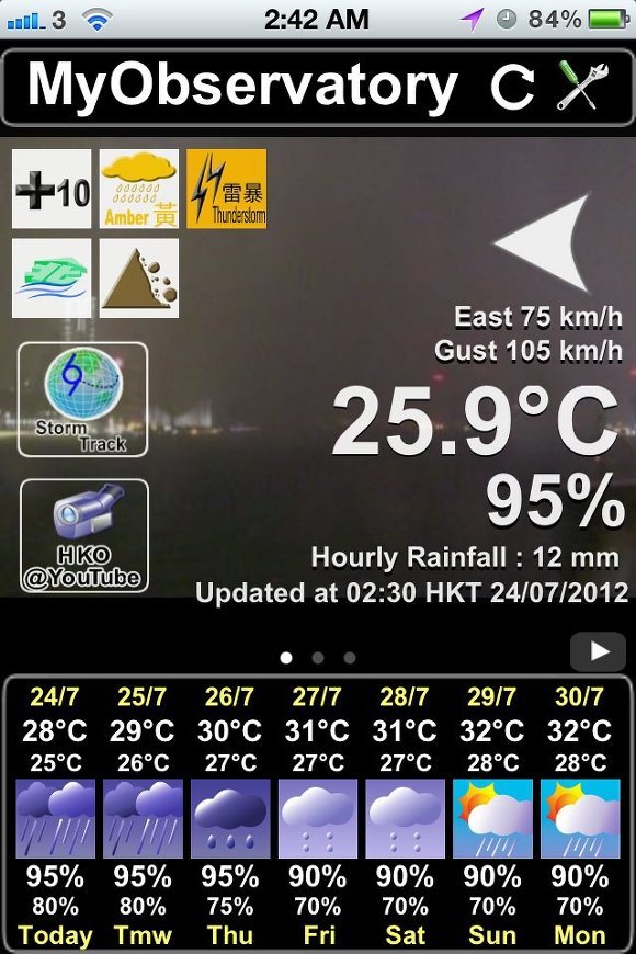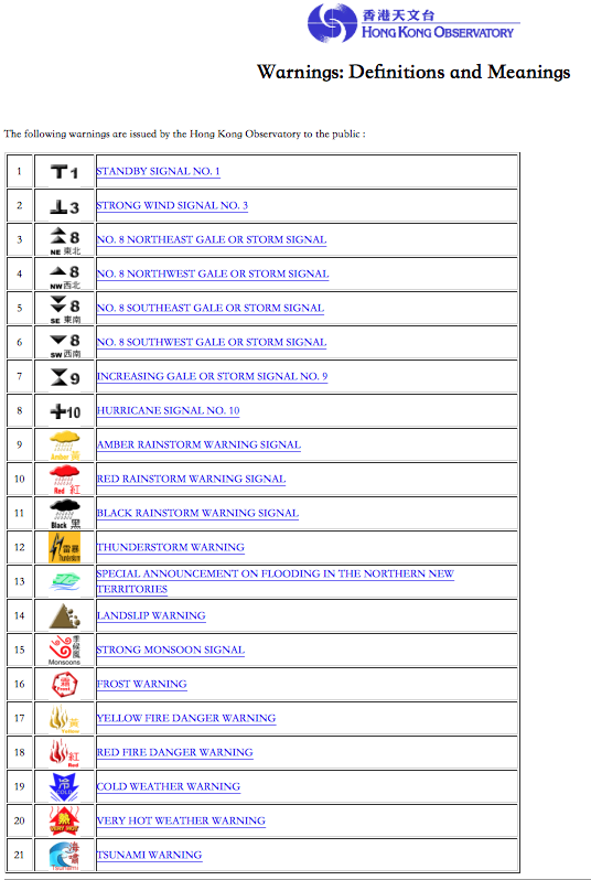 아래 사진은 2012년 7월 4일 새벽 2:42에 찍은 제 전화기 상의 홍콩 기상청 앱의 메인화면입니다. 태풍경보가 가장 강력한 10호이고, 비바람은 노란색이므로 그래도 약한 수준이나, 천둥번개가 치고 있으며, 북쪽 신계지역은 홍수를 주의하고, 모든 산비탈과 언덕이 있는 곳에서 산사태를 주의해야 한다는 기상특보입니다. 글자를 몰라도 이해할 수 있습니다.