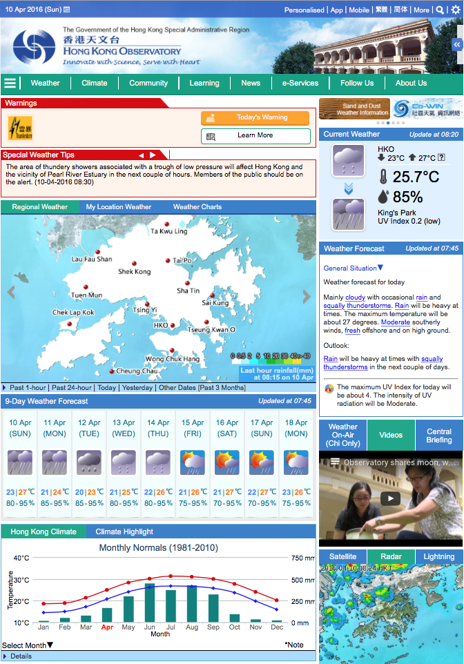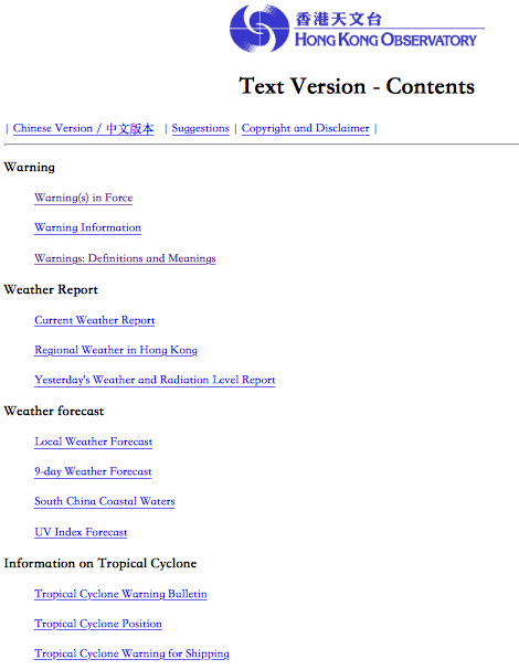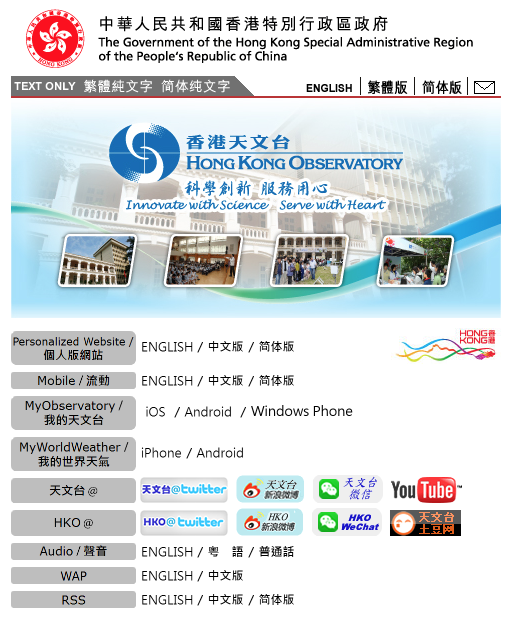 위의 사진은 홍콩 기상청 홈페이지(http://www.hko.gov.hk)의 첫 화면입니다. 사용자의 상황에 알맞게 user interface를 선택할 수 있도록 해서, 원하는 정보를 신속하게 얻을 수 있습니다. 아래 사진의 메인 화면(http://www.hko.gov.hk/contente.htm)으로 이동하면 조금 투박한 듯 보이지만 날씨에 관해 최우선으로 알려야 할 정보들이 한눈에 들어오게 꽉 채우고 있습니다. 로고 아래 세 줄 표시 홈 메뉴에는 시간이 생명 같은 분들을 위해서는 그래픽을 뺀, Text Only 버전도 준비되어 있습니다