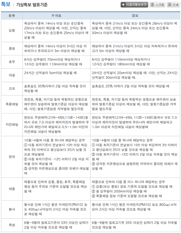 아래는 우리나라 기상청의 기상특보 발표 기준입니다. 매우 세심하게 각 특보를 두 단계로 구분해서 정의하고 있습니다. 그런데 이러한 단계별, 종류별 특보를 국민에게 쉽고 체계적으로 전달하는 시스템이 없습니다. 그저 기상청이 특보를 발령하면 방송과 신문, 그리고 다수의 인터넷 매체들이 해당 특보를 전달합니다. 주의보와 경보 중에 어느 것이 더 강한 것인지가 매번 헷갈리는 저와 같은 사람들에게는 이런 특보 발령은 그리 효과적이지 못합니다. 사회 전체적으로 동일한 기호를 동시에 공유하는 방법을 마련하지 않았기 때문에 우리나라에서는 자연재해가 있을 때마다 방송에서 이런 멘트를 반복해서 듣습니다.