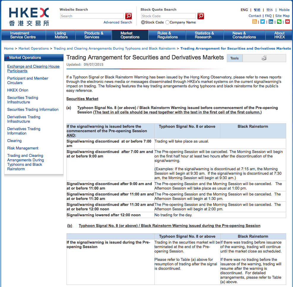 이러한 행동지침의 실천에는 예외가 없어서, 홍콩이 가장 중요하게 생각하는 산업 중의 하나인 금융산업에서 중추적 역할을 담당하는 홍콩 증권거래소조차도 오전 7시까지 태풍경보가 8호 이상이면 (또는 블랙 레인 경보이면) 일단 오전 업무가 중지됩니다. 홍콩 증권거래소의 거래시간에 관한 규칙이 아래 그림에 예시되어 있습니다.