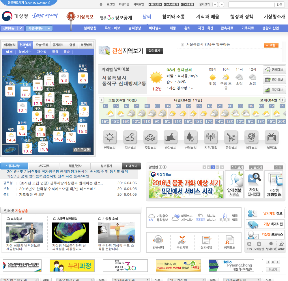 우리나라의 기상청 홈페이지(http://www.kma.go.kr/index.jsp)는 역시 IT 강국답게 멋진 디자인으로 꾸미려고 노력한 흔적이 역력합니다. 또한 생생하고 다양한 정보를 제공하기 위하여 홈페이 구석구석을 빈틈없이 잘 활용하고 있습니다. 하지만 가장 중요한 날씨정보가 홈페이지 전체에서 차지하는 비중이 1/2 정도이고, 색깔과 그래픽이 날씨 정보들을 기타 정보들과 차별적으로 뚜렷하게 보여주지 못하기 때문에 전체적인 정보의 가독성과 분별력이 약하고, "Text Only"와 같은 메뉴는 없는 듯합니다.