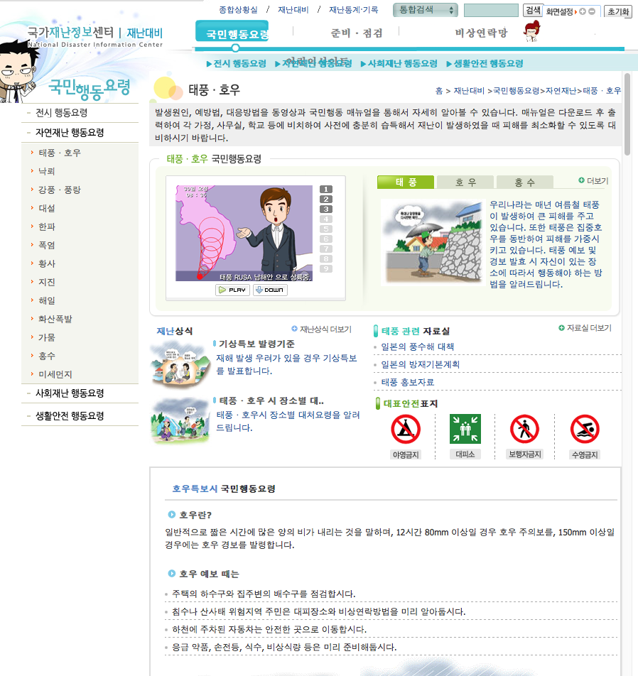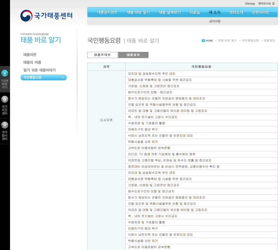 우리나라도 기상청 이외에 국민안전처와 국가재난정보센터, 국가태풍센터 등의 홈페이지들을 통하여 국민들에게 자연재해와 기타 여러 가지 재난 상황을 알리고 대비하는 한편, 재난 시 국민행동요령 등을 홍보하고 있습니다. 기왕이면 이러한 시스템들이 서로 유기적으로 연결되어서 국민들이 보다 편리하고 용이하게 사용할 수 있었으면 하는 바람입니다. 또한 각 기관의 홍보나 업무보고에 관련한 내용보다는 재난 정보 자체를 보다 직접적으로 자세히, 그러면서도 간단하고 알기 쉬운 방법으로 전달할 수 있었으면 좋겠다는 생각을 해봅니다. 그리고 가장 중요하게는 홍콩과 비슷한 방법으로 태풍이 오고 홍수가 날 때 경보의 등급에 따라 자동적으로 작동하도록 약속된 사회 시스템이 마련되었으면 합니다.