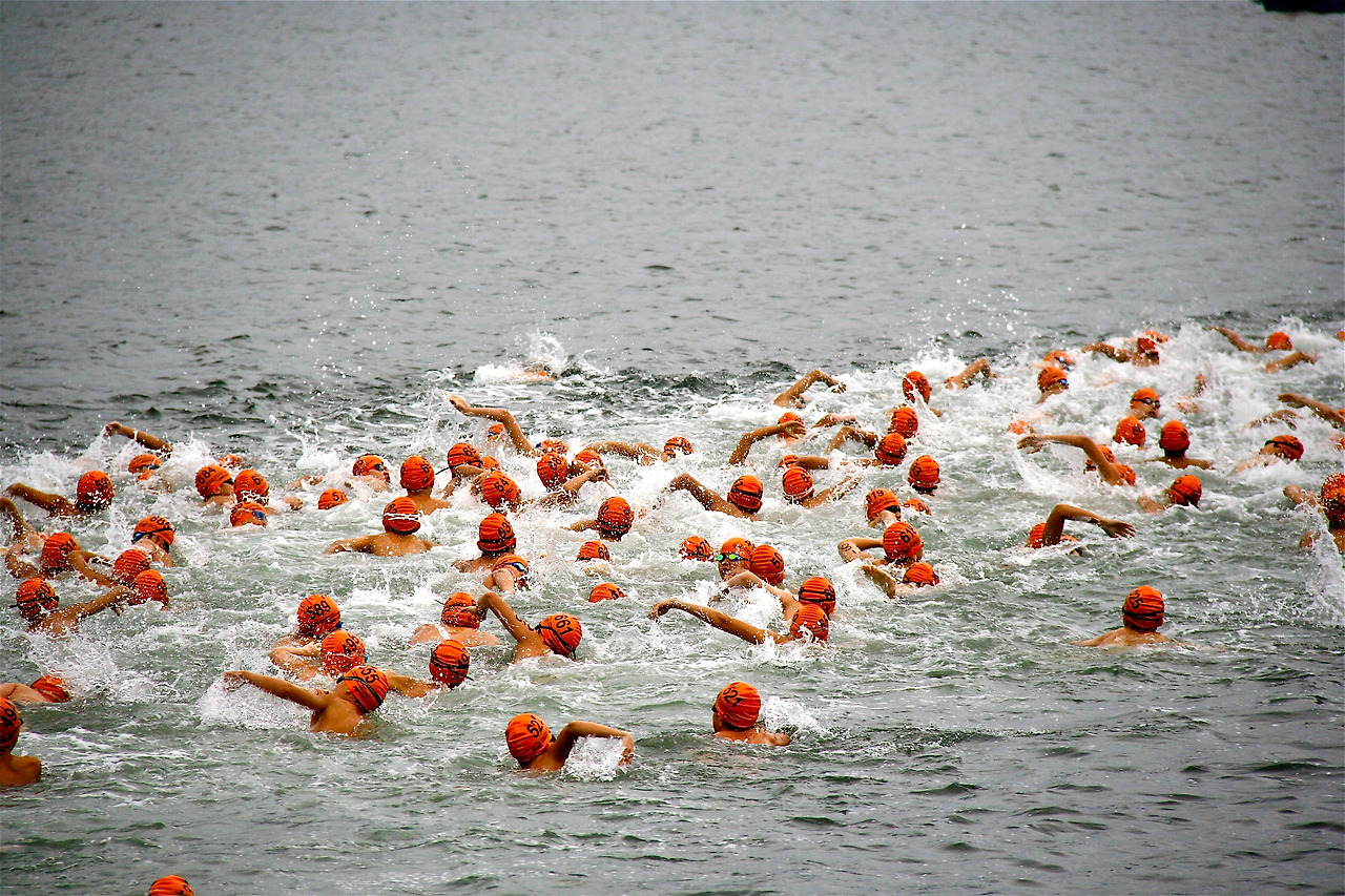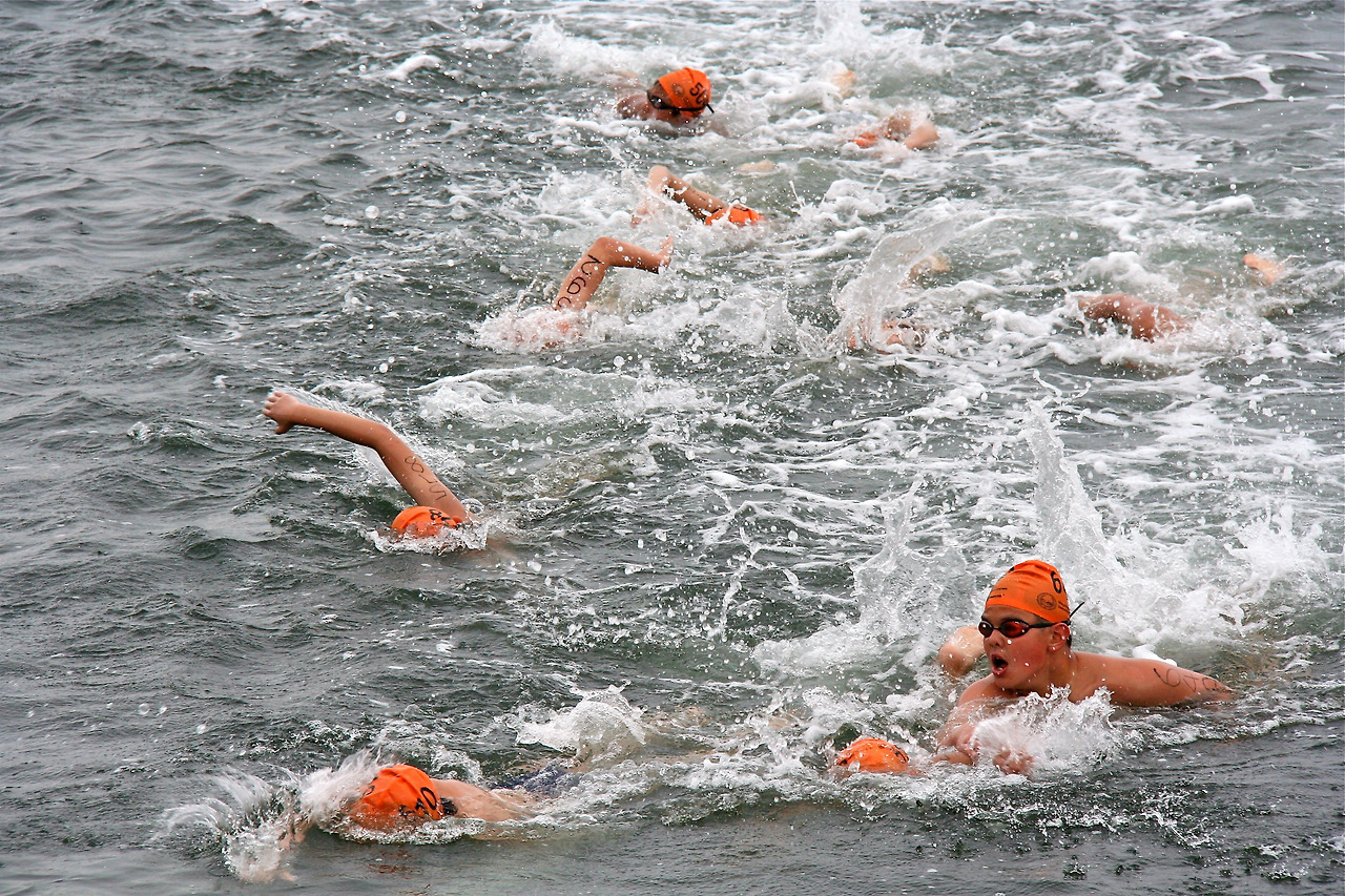 어린 남녀 선수들이 나이별로 그룹을 지어 30분 정도의 간격을 두고 출발합니다. 그룹별로 흰색, 주홍색, 초록색, 파란색 등의 수영모를 쓰고 팔뚝 위의 출전 번호를 자랑스레 휘둘러 보이며, 아이들은 바다로 뛰어듭니다. 수면 위를 날갯짓하듯이 헤엄치는 물고기떼 마냥, 바다 위로 날아오를 것 같은 힘찬 스트로크로 물살을 헤쳐 나갑니다. 간간이 시합을 마치고 못하고 배에 실려 돌아오는 안타까운 모습들이 보이기도 하지만, 대부분의 아이들은 50분 안에 돌아옵니다.