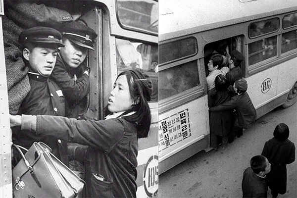 엔진룸보다 더 큰 차이는 바로 안내양입니다. 승객들이 타고 내리면 "오라이"라고 소리치며 한 손으로 버스 옆을 탕탕 때리며 운전기사에게 출발하라는 신호를 보냈죠. 지금이야 지하철이 서울의 구석구석까지 뻗어있지만, 제가 중학교에 입학하기 직전에 2호선이 신설동에서 종합운동장까지만 부분 개통이 되었습니다. 지하철의 추억은 다음에 따로 적어 보죠. 그러니까 840만 서울의 인구 대부분은 시내버스를 이용해서 출퇴근하던 시절엔 아래 사진에서 보는 소위 "만원 버스"가 지극히 일상이었습니다. 버스 안내양은 왼손으로 문 손잡이를 잡고 왼발 끝이 버스 바닥을 딛고 힘을 줄 정도만 되면 오른손으로 버스 몸통을 두드리며 "오라이"를 외쳤습니다. 이렇게 집 앞 정류장을 출발한 버스가 곧바로 사거리에서 우회전해야 하는데 아직 버스 안으로 다 밀고 들어가지 못하면 안내양은 물론이거니와 한두 명의 몸뚱이가 버스 밖에 매달려 있는 경우도 다반사였습니다. 요즘 같으면 상상하기 어려운 풍경이죠. 학생 모자나 책가방의 버스 밖으로 떨어지는 일도 가끔 발생하죠. 물론 안내양의 신호에 따라 운전기사가 버스를 세웁니다. 도로에 차가 많지 않아서 가능했죠. 당시엔 잠실 5단지 앞에서 14번 시내버스를 타면 삼성동, 봉은사, 강남구청, 압구정동, 한남동을 거쳐 명동입구 중앙극장 앞까지 불과 25~30분이면 갈 수 있었습니다.