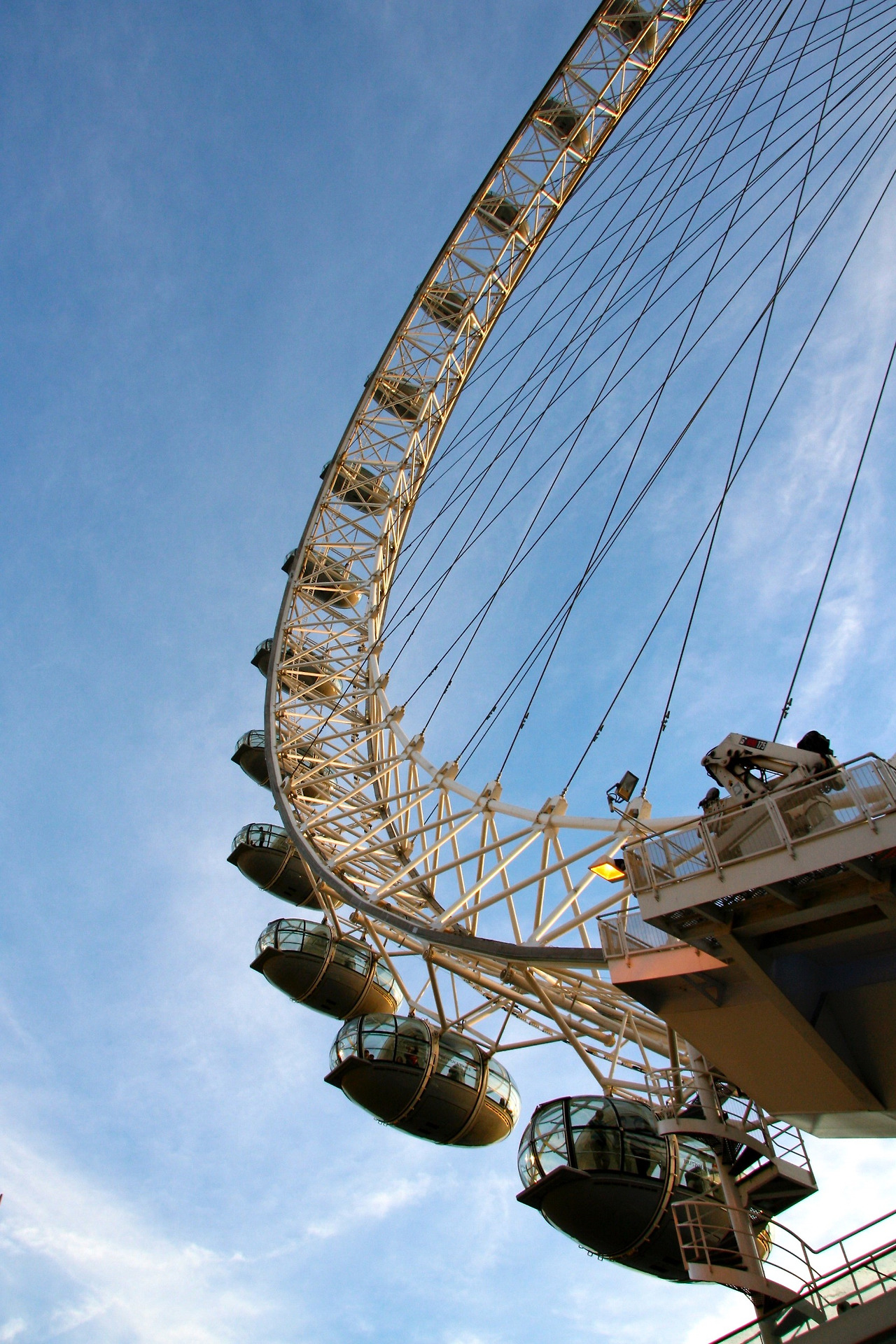 눈썰미 있게 살펴보신 분들은 아시겠지만, 런던 아이는 세계에서 유일하게 지지대가 한쪽에만 있는 구조입니다. 동그란 회전차 부분을 템즈강 위에 띄어 놓고는 강둑에 세운 A프레임 위로 와이어로프를 걸고 끌어 당겨서 세웠죠. 알고 보면 재밌지만 무섭기도 하죠?