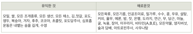 禁酒 이틀째 일기(https://brunch.co.kr/@690101/23)에서 소개했던 8 체질에 따르면 제게 유익하고 해로운 것들은 아래 표와 같습니다. 이것들을 다 믿는 것은 아니지만, 상당 부분 제가 몸으로 좋고 나쁨을 느끼는 것들이 꽤 많습니다.