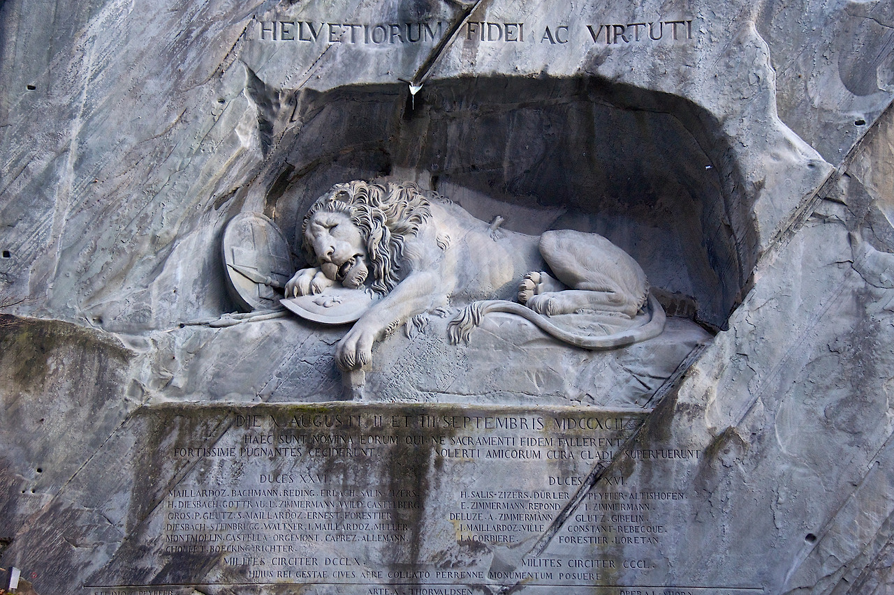 가장 오래된 목조 다리 가운데 하나인 카펠교와 함께 루체른의 상징이 된 빈사의 사자는 루이 16세를 지키다 죽어간 용병들을 기리어 1821년에 만들어졌습니다. 사자가 죽어가면서도 앞발로 지키고 있는 방패의 백합은 부르봉 왕조의 문장(紋章)이고, 그 옆의 다른 방패는 스위스의 국장(國章)이 새겨져 있습니다. 죽음으로써 지켜야 했던 "신의"와 "명예"를 상징합니다. 돈을 받는 대가로 목숨을 바치기로 했던 약속을 저버린다면, 자신들의 목숨을 구할 수는 있었겠지만, 후손들은 용병의 기회를 잃어버리고 알프스의 산속에서 추위와 맞서며 허기진 배를 움켜쥐고 살아야 했을 겁니다. 용맹히 싸워 명예로운 죽음을 택하지 않았다면, 스위스는 주변 강대국의 침략을 견디기 어려웠을 것이고, 중립국으로서의 지위도 인정받기 어려웠을 겁니다. 히틀러조차도 득(得)보다 실(失)이 많을 것으로 예상되기에 스위스는 건드리지 않았죠.