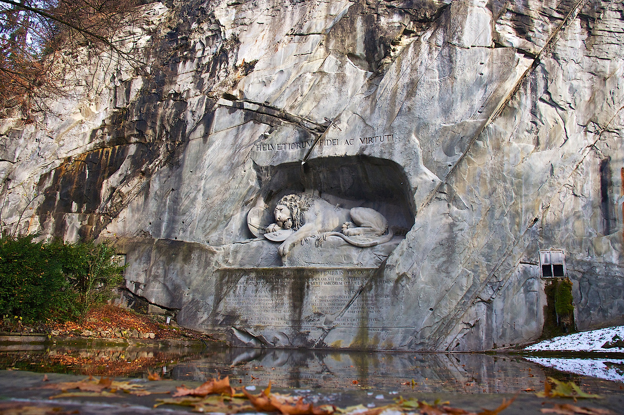그곳에 가면 늘 서늘한 기운이 감돕니다. 단지 그곳이 2만 년 전에 형성된 빙하 동굴 바로 옆에 위치했기 때문은 아닙니다. 철제 난간으로 만들어진 입구를 지나 벽돌을 깔아 놓은 바닥 위로 몇 걸음 내딛이면 바로 옆의 빙하 동굴에서 내려온 물이 고였을 듯한 작은 연못을 만납니다. 연못 건너편에는 수백만 년의 빙하 시기를 견디어 온 듯한, 푸른색과 회색이 얼음처럼 창백하게 뒤섞인 화강암 절벽이 서 있습니다. 아마도 사람의 손으로 깎아내린 듯한 절벽의 한 가운데에 창에 찔려 신음하며 죽어가는 사자의 모습이 조각되어 있습니다. 가로 10m, 세로 6m나 되는 커다란 사자는 연못을 사이에 두고 산 자(者)와 죽은 자(者)를 구분하여 줍니다. 부러진 창이 몸통에 박힌 채 두 조각이 난 방패 위에 앞발을 얹고 신음하는 사자는 스위스인들의 가슴 절절한 역사를 온몸으로 보여 주고 있습니다.