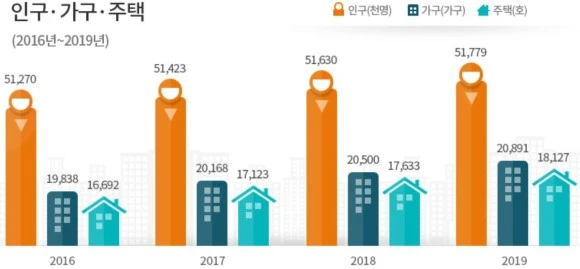 단순히 감소하는 인구수만 보고 집값이 떨어질 것이라 예상하면 안 된다. 같이 확인해봐야 할 것은 인구 대비 주택수 비율과 가구 대비 주택수 비율이다.