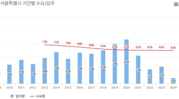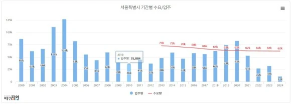 서울의 아파트 매매가격지수 동향과 기간별 수요/입주 그래프를 비교해보면 두 그래프는 절대적으로 연관되어 있지 않다.