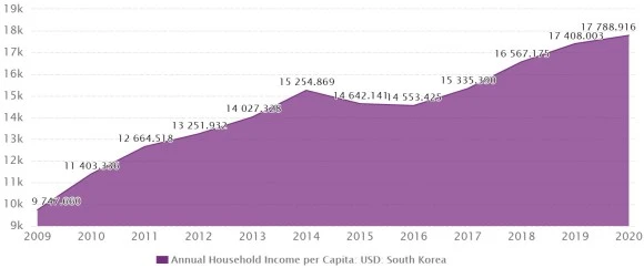 아래 그래프는 우리나라의 1인당 가구 소득이다. 2020년에 미국 달러 기준 17,788 USD를 기록했다. 가장 높은 기록이다.