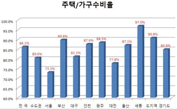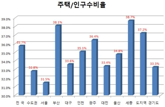 이와 비슷하게 가구 수 대비 주택수에서도 세종과 부산이 높다. 주택수 비율이 가장 낮은 곳은 73.1%의 서울이고 그다음이 77.8%의 대전이다.