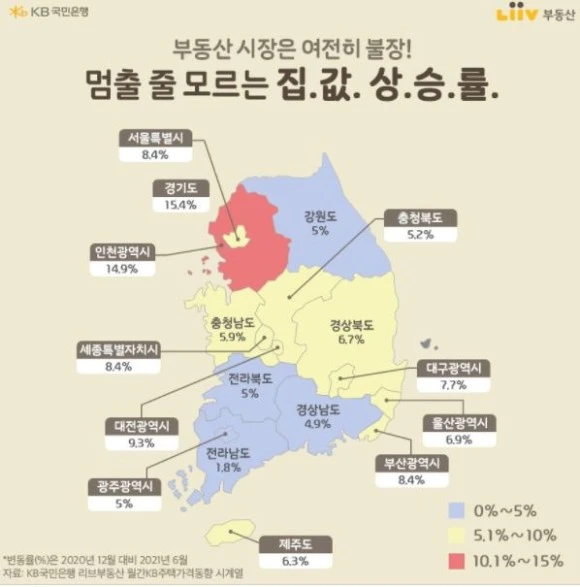 2020년 인구, 가구, 주택 현황이 2021년에 어떻게 영향을 미쳤는지 서울과 대전, 세종과 부산의 집값 순위 또는 상승률을 확인해보자. 아래는 2020년 12월 대비 2021년 6월의 집값 상승률이다.