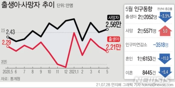 출생아 수보다 사망자 수가 더 많은 인구 자연 감소 현상은 19개월째 지속됐다. 2021년 5월 사망자 수는 25,571명으로 2020년보다 1,226명 늘었다.