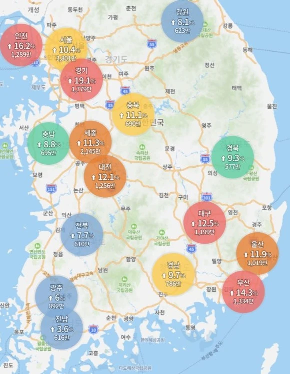 우선 인구수, 가구 수에 비해 주택수 비율이 낮은 서울과 대전의 집값 상승률을 보면 각각 8.4%, 9.3%다. 인구수, 가구 수에 비해 주택수 비율이 높은 세종과 부산은 둘 다 8.4%이다.